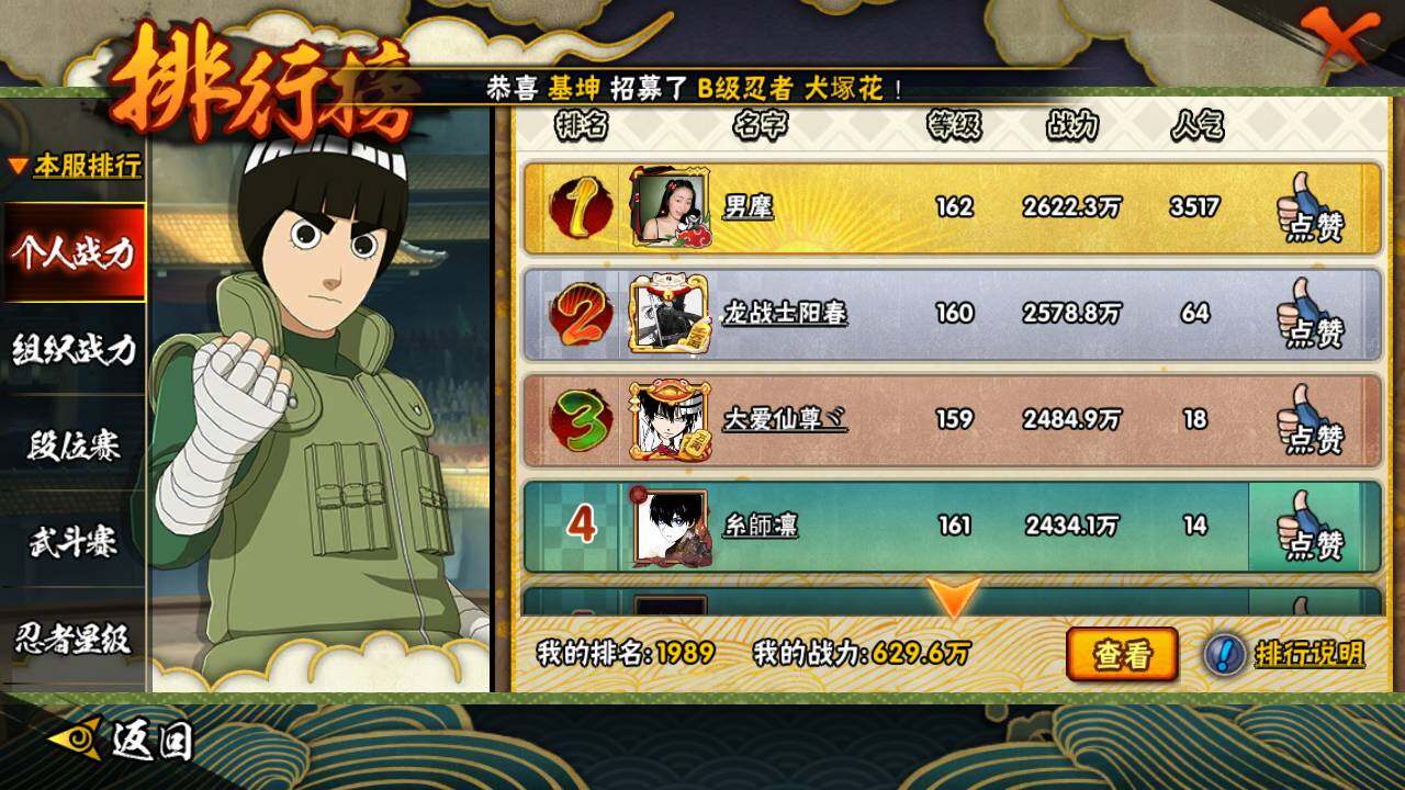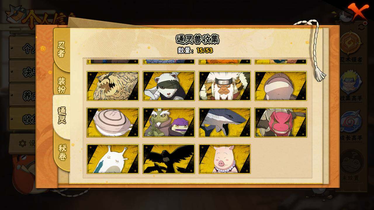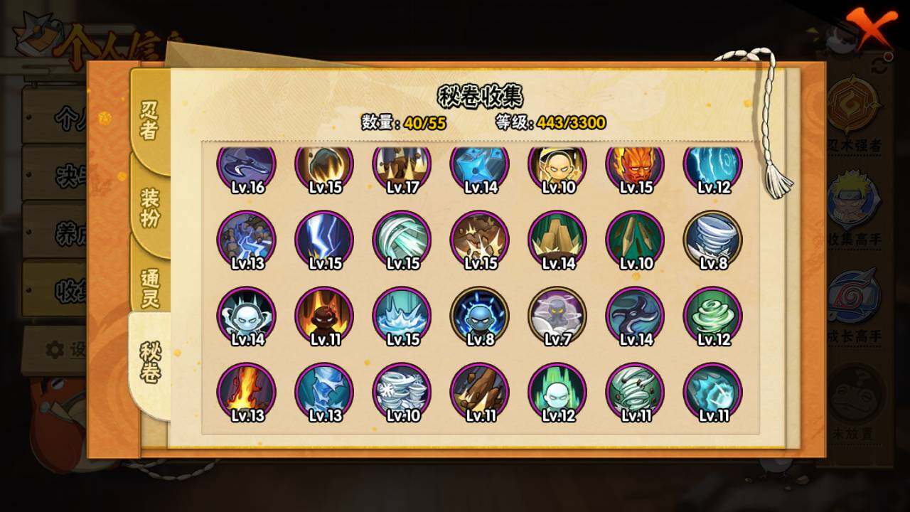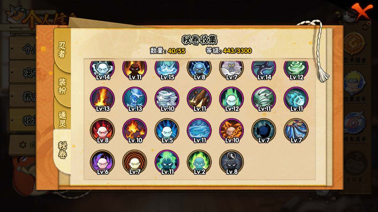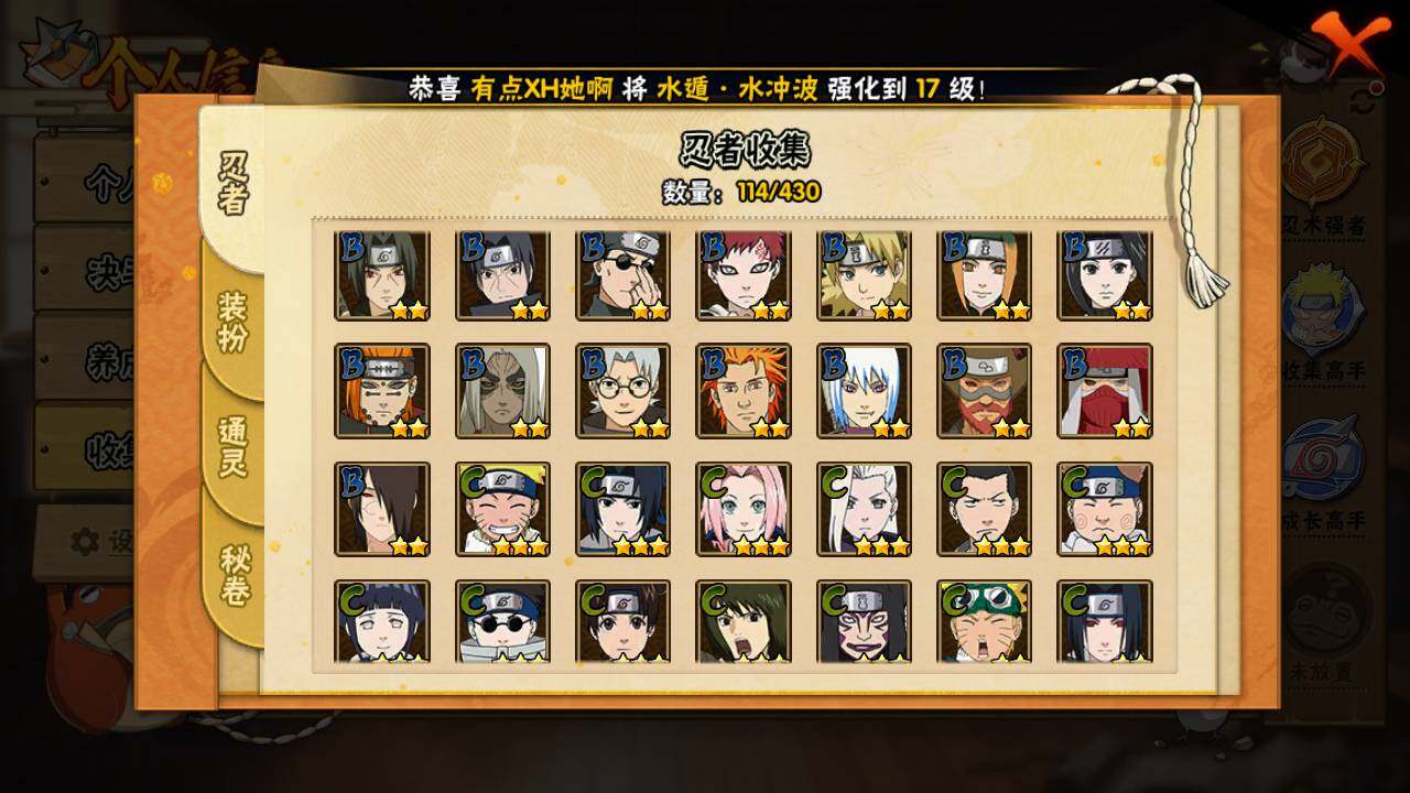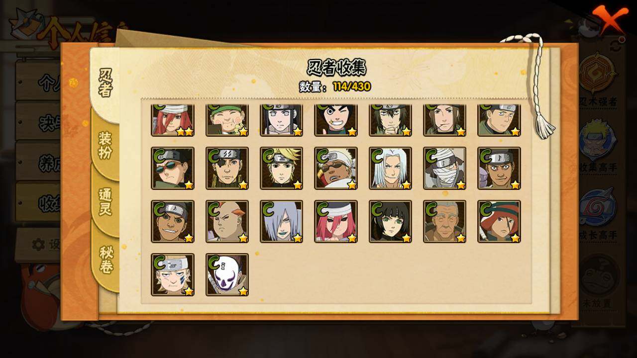 【S级忍者】:千手扉间「秽土转生」(3星),千手柱间「秽土转生」(3星),宇智波鼬「秽土转生」(3星),宇智波带土「忍界大战」(3星),自来也「舞之豪杰」(3星),大蛇丸(3星),漩涡鸣人「九喇嘛连结」(3星),宇智波斑「五影会谈」(3星),漩涡鸣人·宇智波佐助(3星)