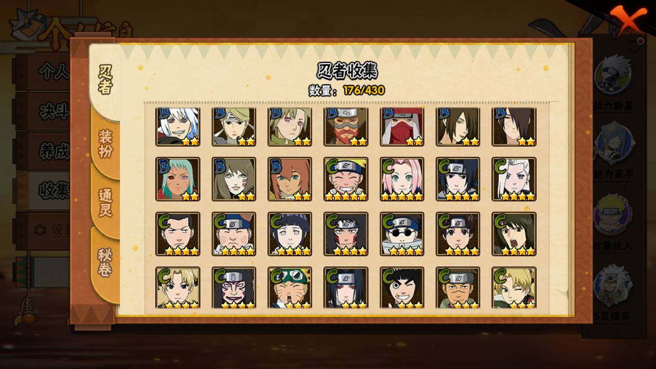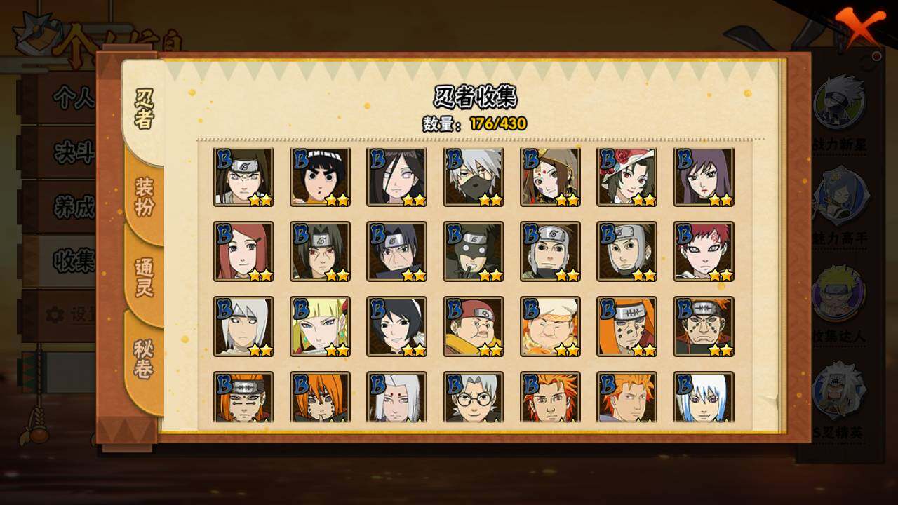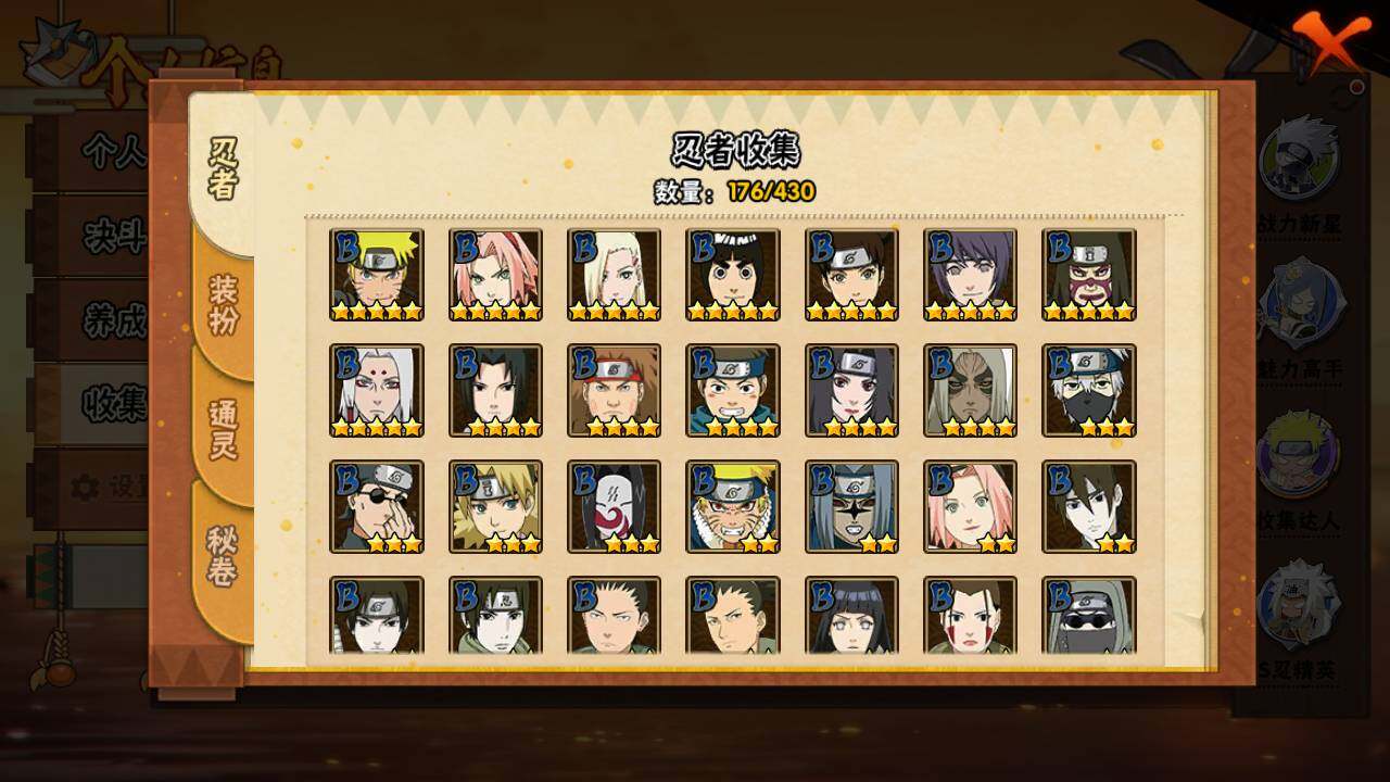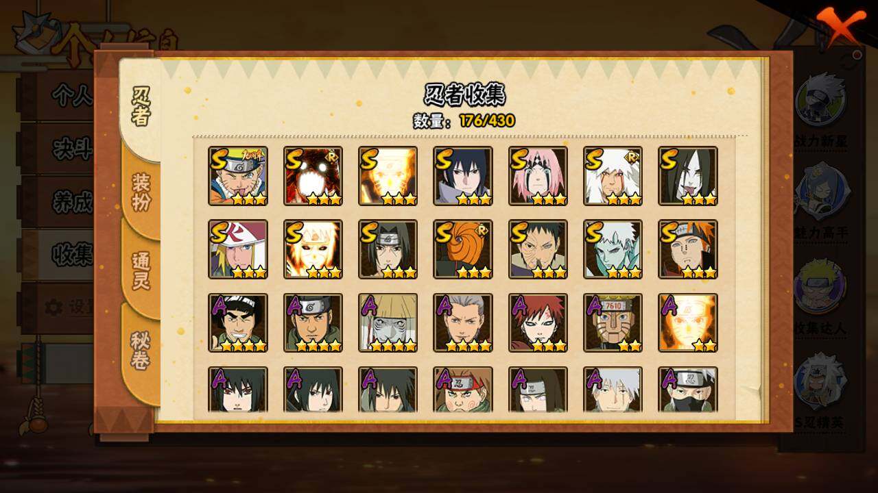 【S级忍者】:春野樱「忍界大战」(3星),宇智波带土「忍界大战」(3星),宇智波鼬「须佐能乎」(3星),自来也「舞之豪杰」(3星),大蛇丸(3星),波风水门(3星),漩涡鸣人「九喇嘛连结」(3星),佩恩「天道」(3星),宇智波佐助「永恒万花筒」(3星),漩涡鸣人「暴怒·第六尾