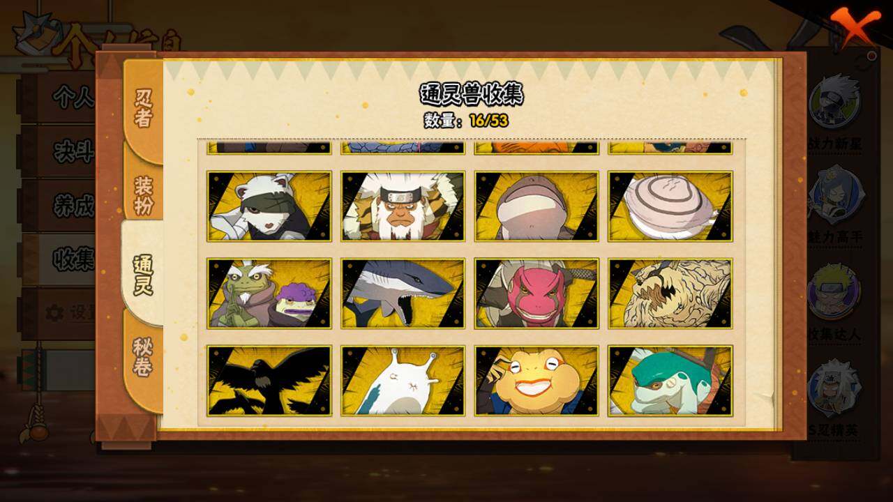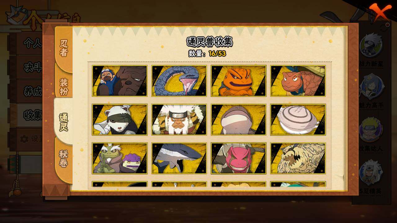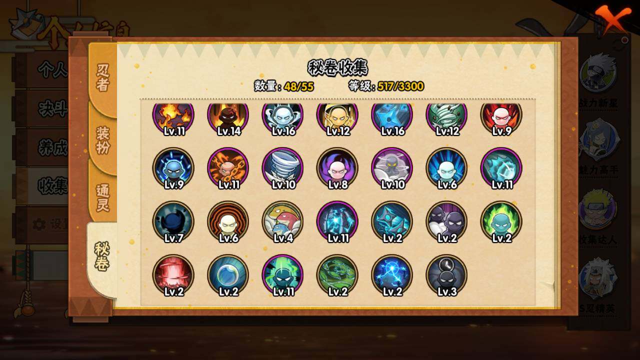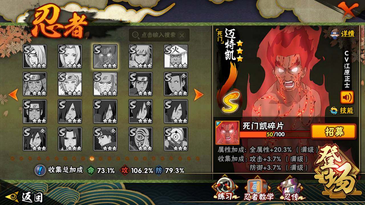 【S级忍者】:春野樱「忍界大战」(3星),宇智波带土「忍界大战」(3星),宇智波鼬「须佐能乎」(3星),自来也「舞之豪杰」(3星),大蛇丸(3星),波风水门(3星),漩涡鸣人「九喇嘛连结」(3星),佩恩「天道」(3星),宇智波佐助「永恒万花筒」(3星),漩涡鸣人「暴怒·第六尾