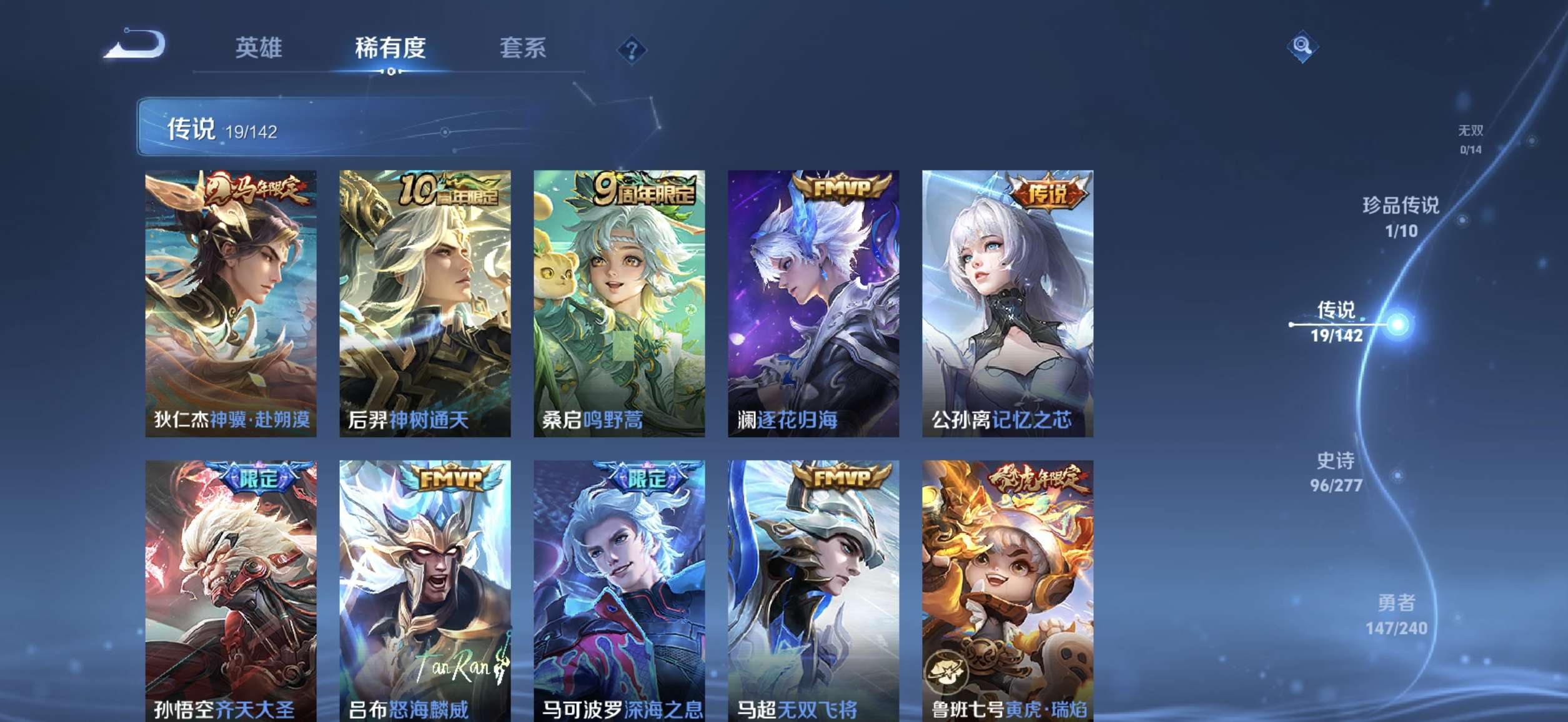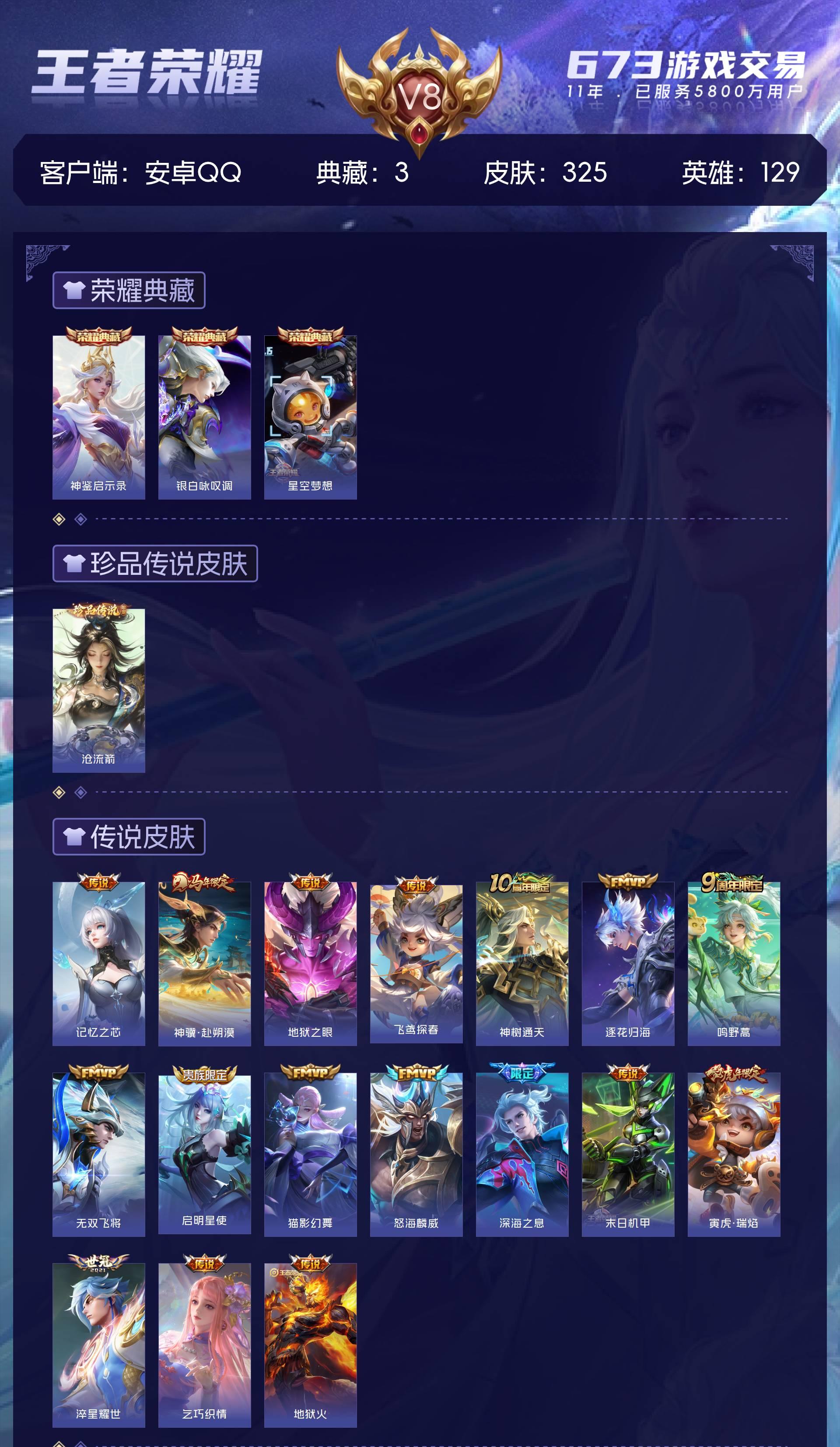 V8 皮肤325 英雄129 最强王者 荣耀典藏3 珍品传说1 星传说2 传说18