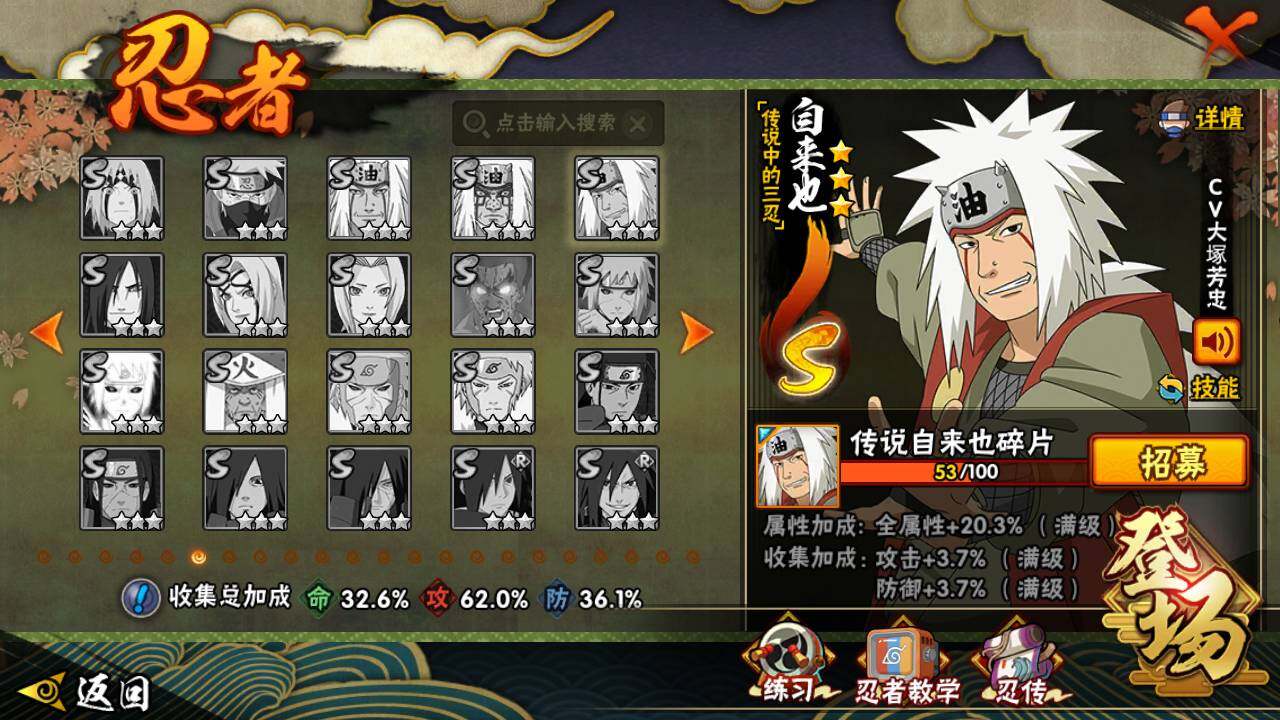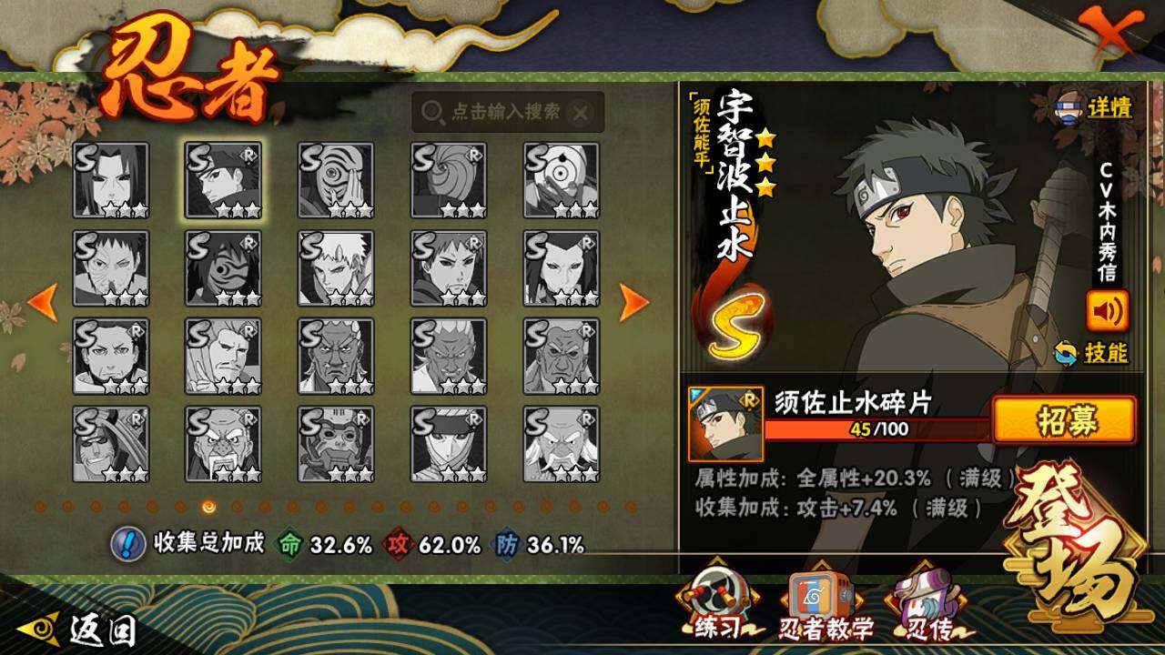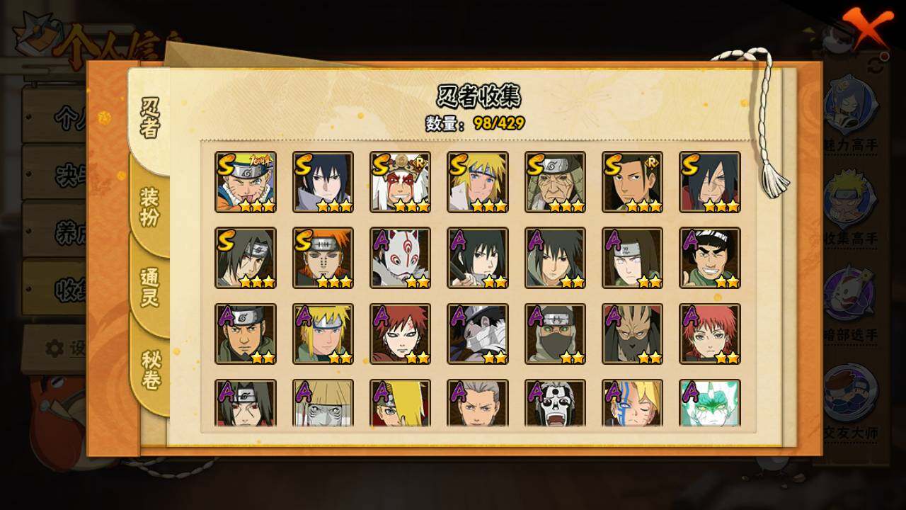 【S级忍者】:猿飞日斩「秽土转生」(3星),宇智波斑「秽土转生·解」(3星),宇智波鼬「须佐能乎」(3星),千手柱间「木叶创立」(3星),自来也「舞之豪杰」(3星),波风水门(3星),佩恩「天道」(3星),宇智波佐助「永恒万花筒」(3星),漩涡鸣人·宇智波佐助(3星)