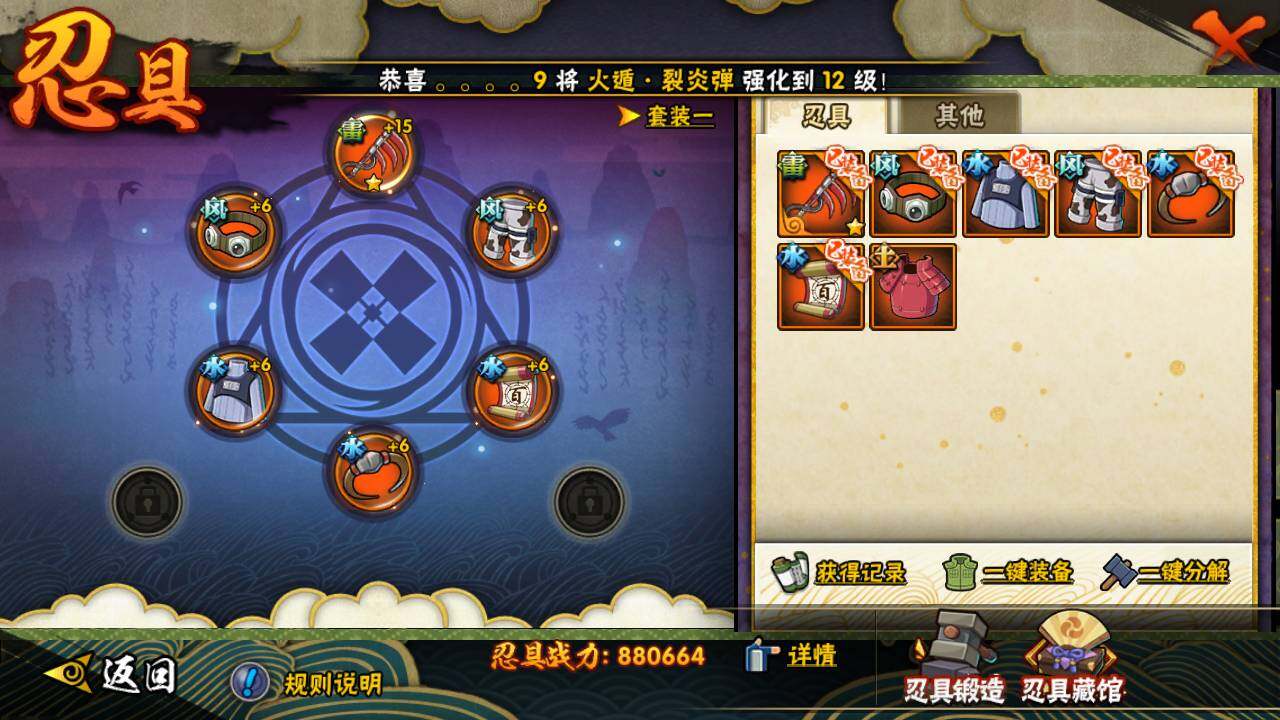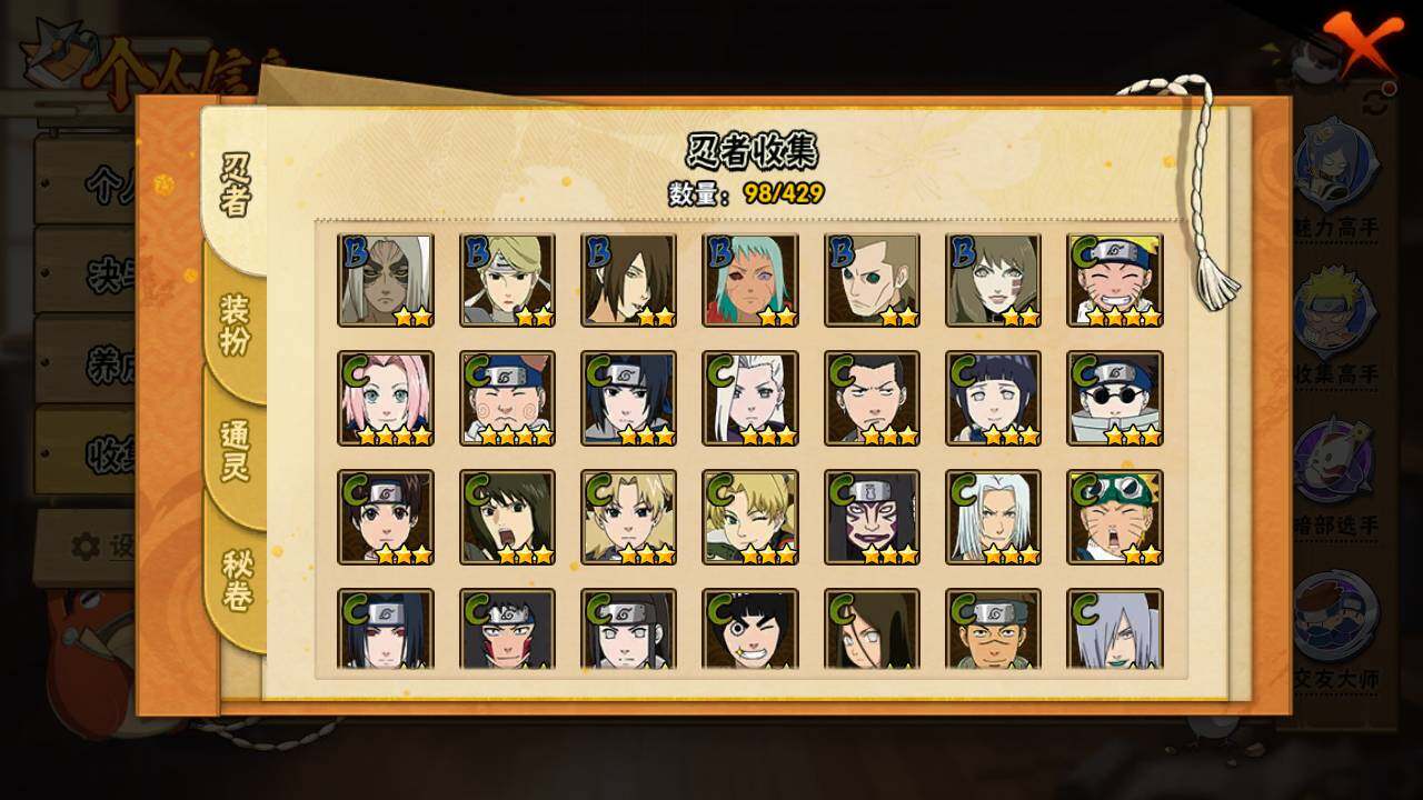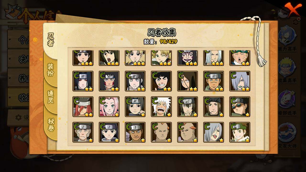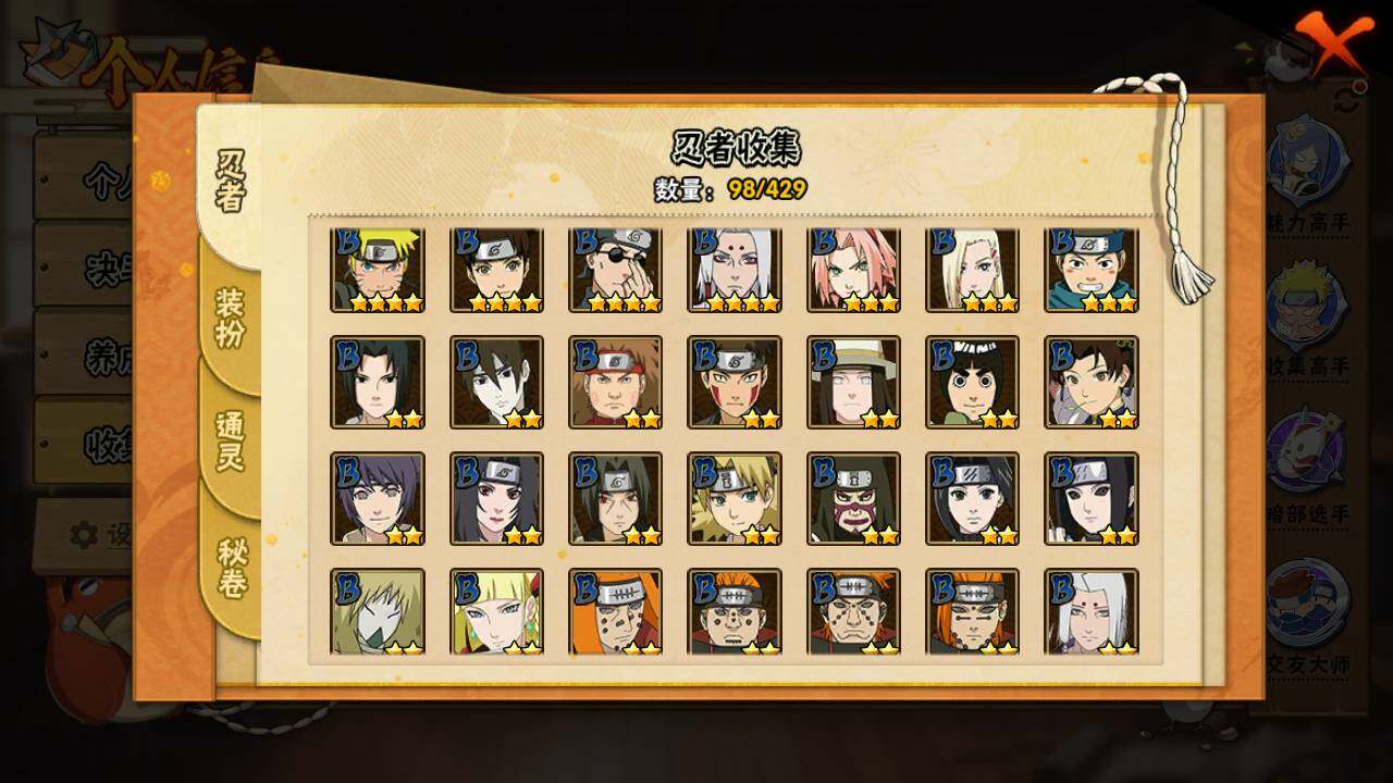 【S级忍者】:猿飞日斩「秽土转生」(3星),宇智波斑「秽土转生·解」(3星),宇智波鼬「须佐能乎」(3星),千手柱间「木叶创立」(3星),自来也「舞之豪杰」(3星),波风水门(3星),佩恩「天道」(3星),宇智波佐助「永恒万花筒」(3星),漩涡鸣人·宇智波佐助(3星)
