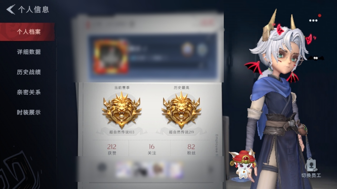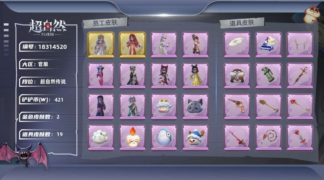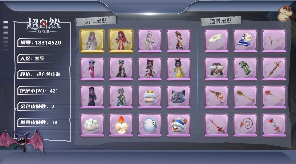 金色皮肤数量: 2 紫色皮肤数量: 8 道具皮肤数量: 19 段位: 超自然传说 员工: 逍遥,薇薇