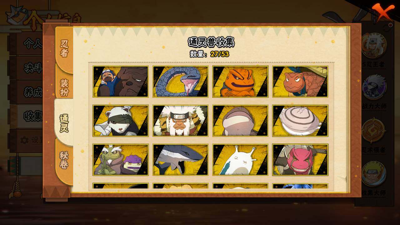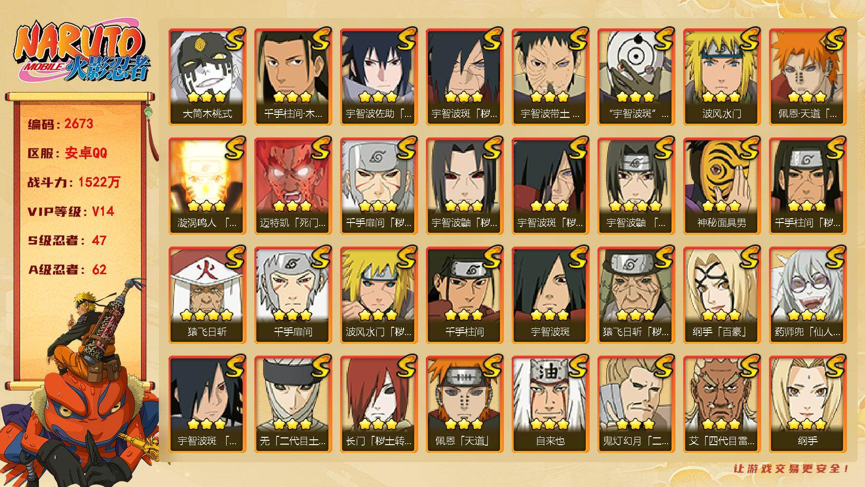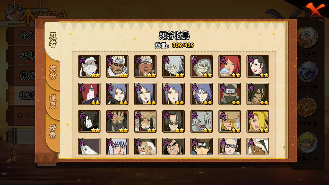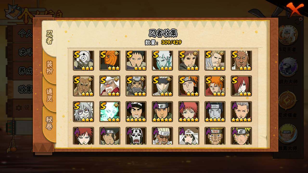 【S级忍者】:长门「秽土转生」(3星),半藏「秽土转生」(3星),猿飞日斩「秽土转生」(3星),波风水门「秽土转生」(3星),千手扉间「秽土转生」(3星),千手柱间「秽土转生」(3星),宇智波鼬「秽土转生」(3星),宇智波斑「秽土转生」(3星),宇智波斑「秽土转生·解」(3星),春野樱「忍界大战」(3星