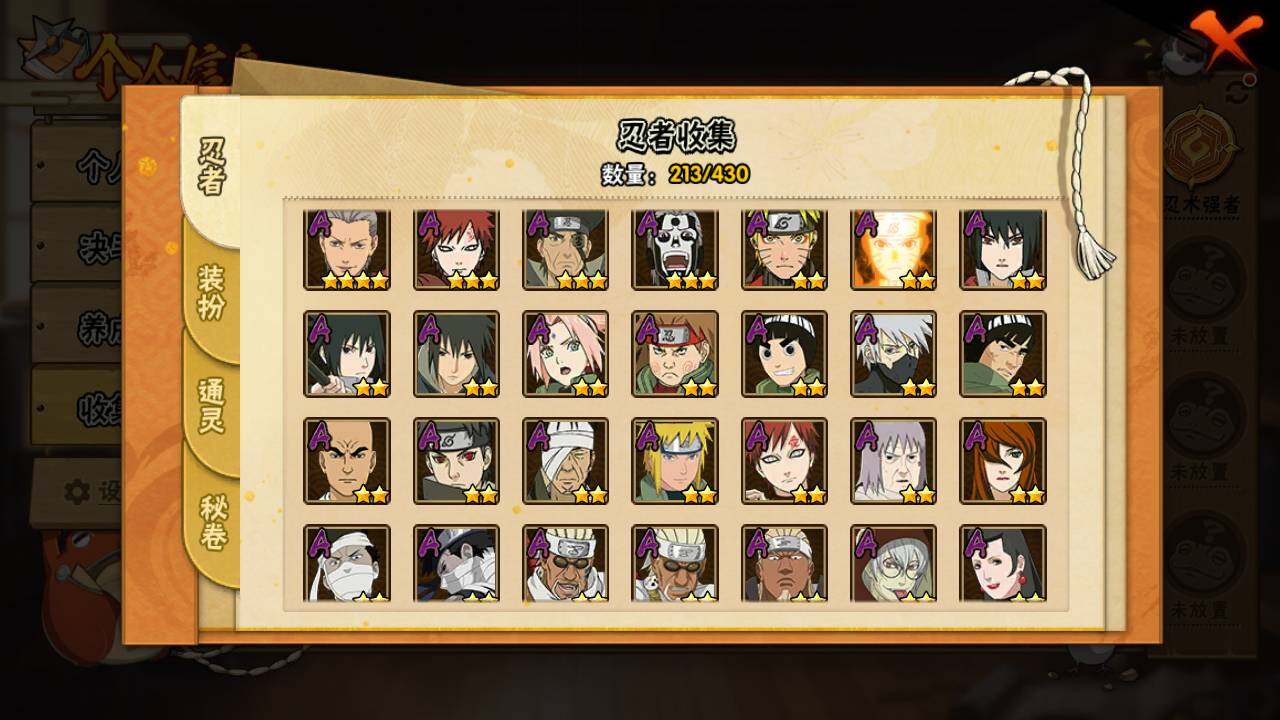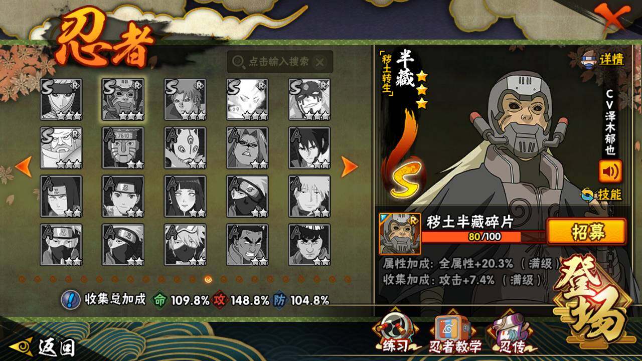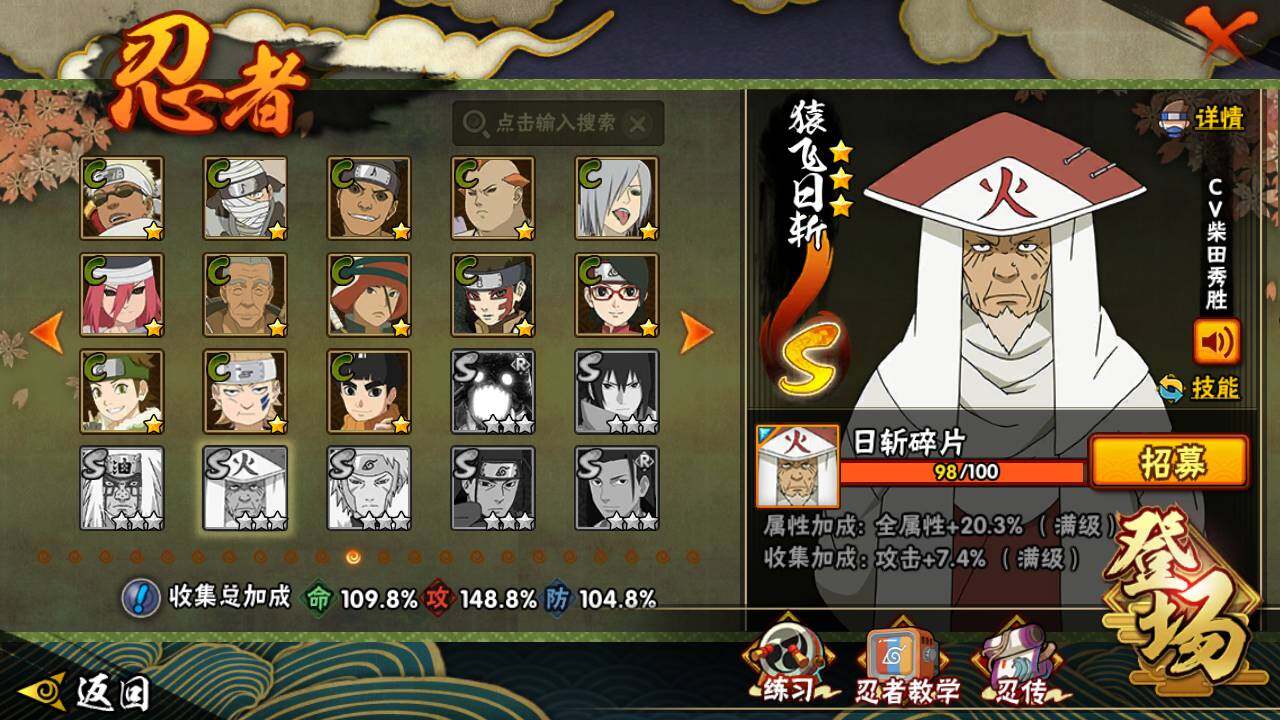 【S级忍者】:长门「秽土转生」(3星),猿飞日斩「秽土转生」(3星),波风水门「秽土转生」(3星),千手扉间「秽土转生」(3星),千手柱间「秽土转生」(3星),宇智波斑「秽土转生」(3星),春野樱「忍界大战」(3星),宇智波带土「忍界大战」(3星),宇智波鼬「须佐能乎」(3星),旗木卡卡西「须佐能乎」(