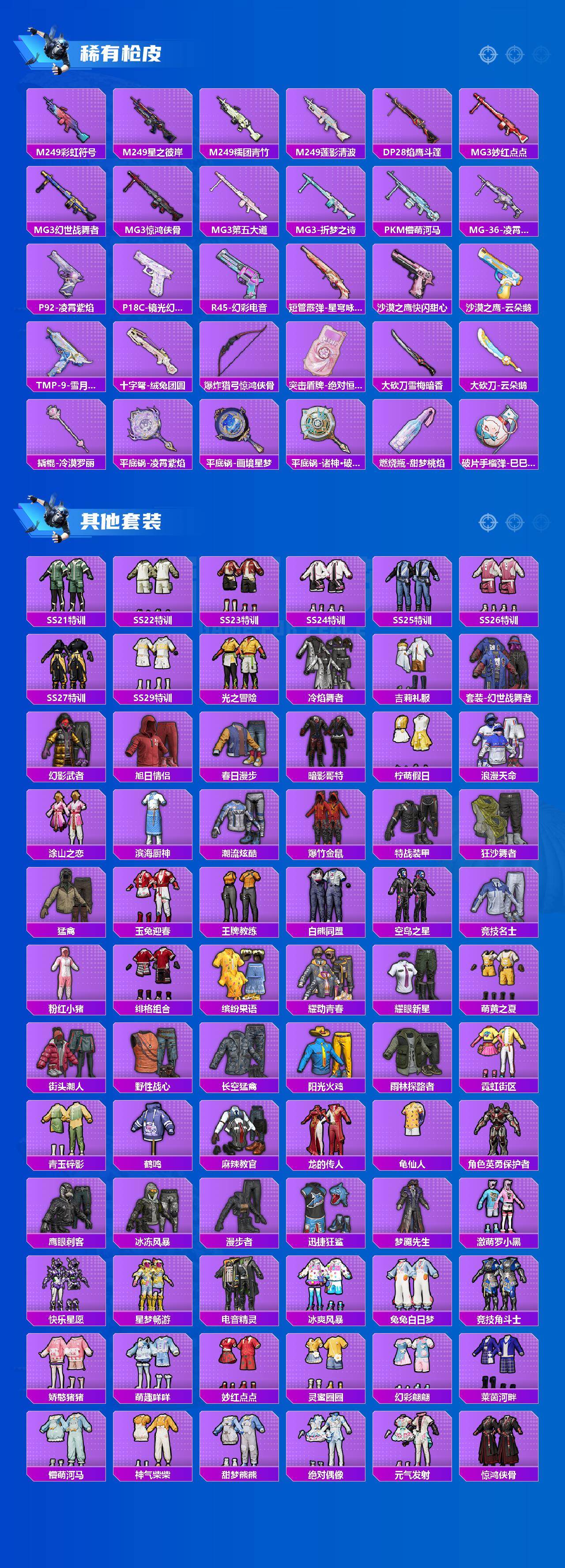 【粉色套装】:粉装-极限特训,粉装-幻影战神,粉装-闲梦青缨,粉装-莲影清波,角色-千金淑猫,粉装-星穹咏叹调