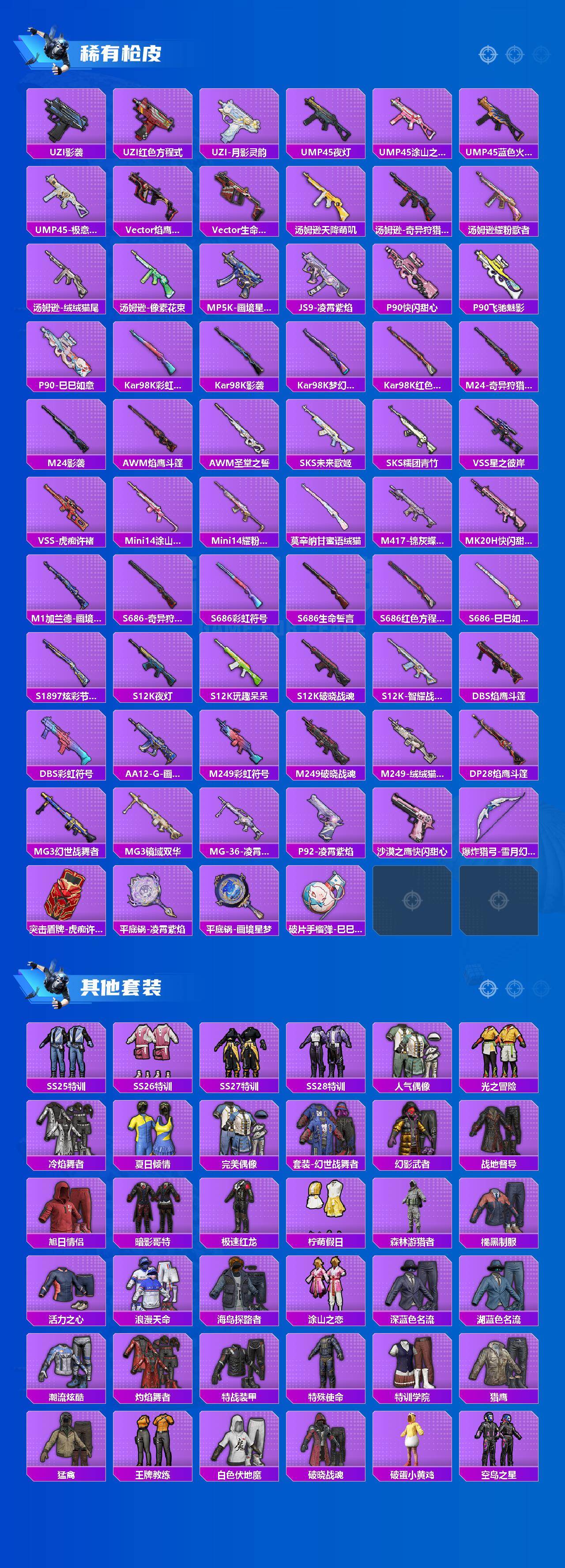 【HP2805】138套装/枪械7/装备194/载具1/战备131/热力值50929/五级AUG-暖羊咩咩/四级UMP45-萌骑冒险/五级AKS-74U-森灵之息/五级Kar98K-巳巳如意/五级Mk14-福马献瑞/五级DP-28-豹影疾电/三级信号枪-金乌曜日/套装-浪漫天命/套装-都市猎人/套装-深海小丑鱼/套装-龟仙人/套装-暗影哥特/粉装-幻影战神/粉装-桃粉嫣然/仰望U7(阿盖尔紫)/AUG-暖羊咩咩/UMP45-萌骑冒险/AKS-74U-森灵之息/Kar98K-巳巳如意/Mk14-福
