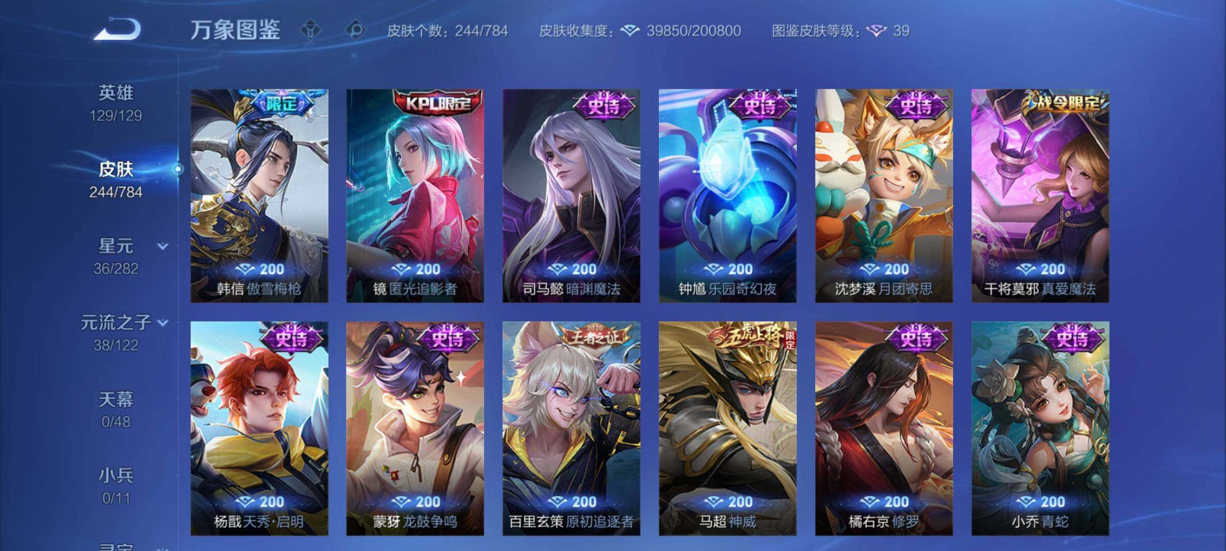 V8-244皮肤-2典藏皮肤-1典藏英雄-1无双-1珍品传说-20传说-70史诗