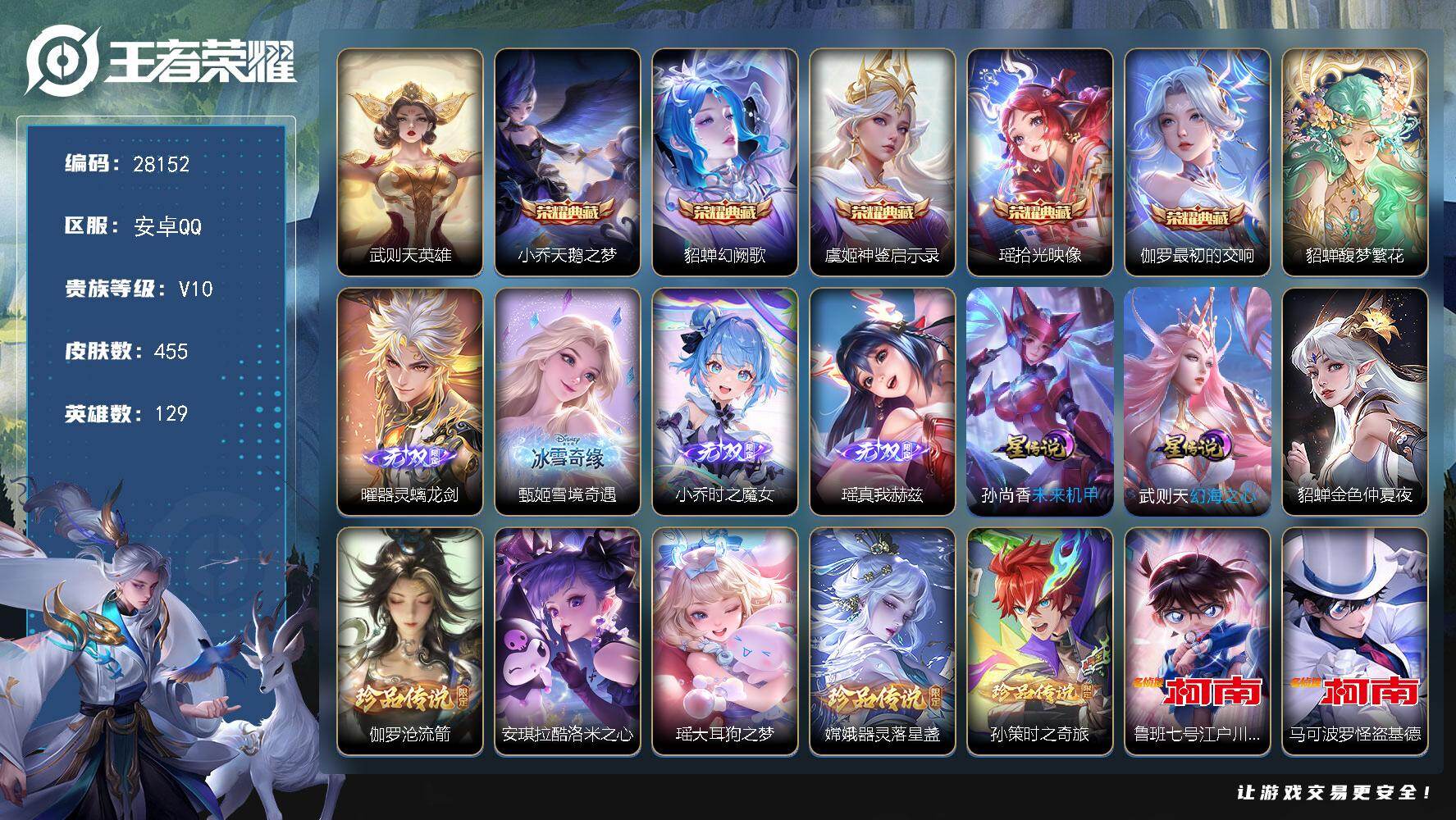 可换绑【V10高质量精品女号·貂蝉瑶全皮·马年蛇年全套·1珍品无双·4无双·6典藏·7珍品怪盗基德·续相思·孙尚香龙限·时雨天司·祈雪灵祝·灵宝亲密度1.6万·24万贵族积分】53按键,3星传说,3天幕,56戳戳,10王者印记,五级铭文170,可二次CD19284,安卓Q-V10-455皮肤-5典藏皮肤-1典藏英雄-1珍品无双-4无双-7珍品传说-48传说-137史诗【英雄全皮】:刘禅全皮,貂蝉全皮,姜子牙全皮,孙权全皮,苍全皮,瑶全皮,敖隐全皮,桑启全皮,赵怀真全皮,戈娅全皮,空空儿全皮,影全