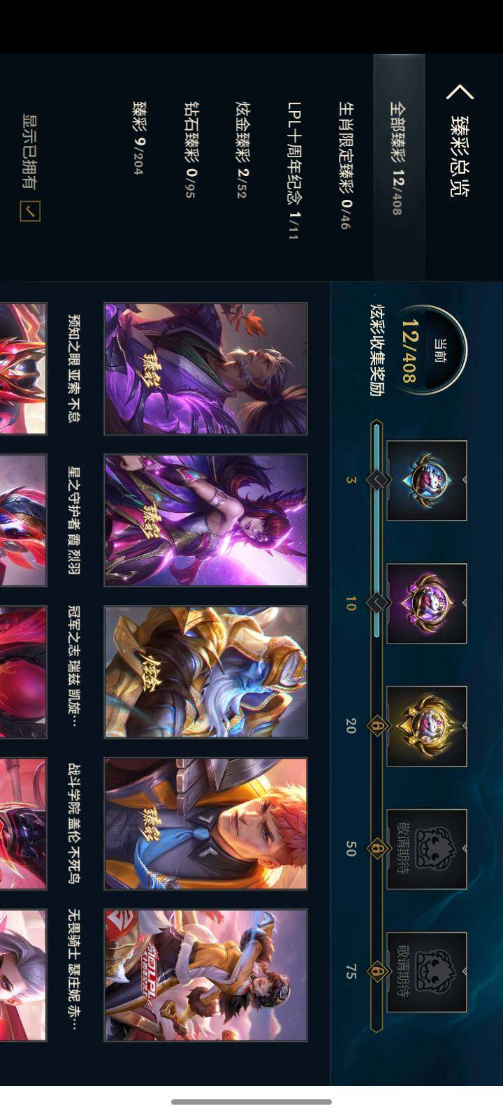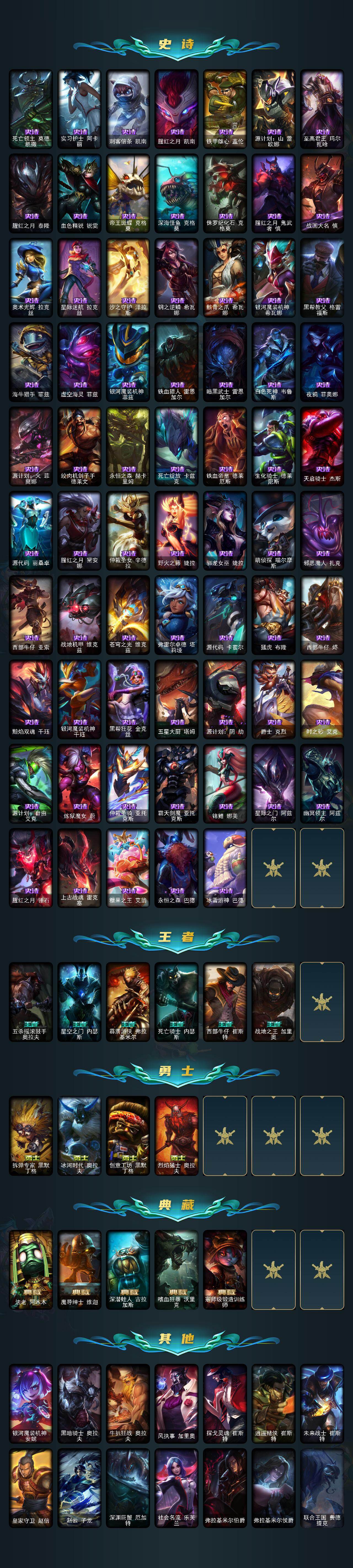【至臻皮肤】:至臻魅惑女巫厄运小姐,至臻KDA伊芙琳,至臻黑夜使者李青,至臻灵能特工伊泽瑞尔,至臻玉剑传说武剑仙锐雯,至臻KDA阿狸,至臻KDAALLOUT卡莎,至臻真实伤害奇亚娜