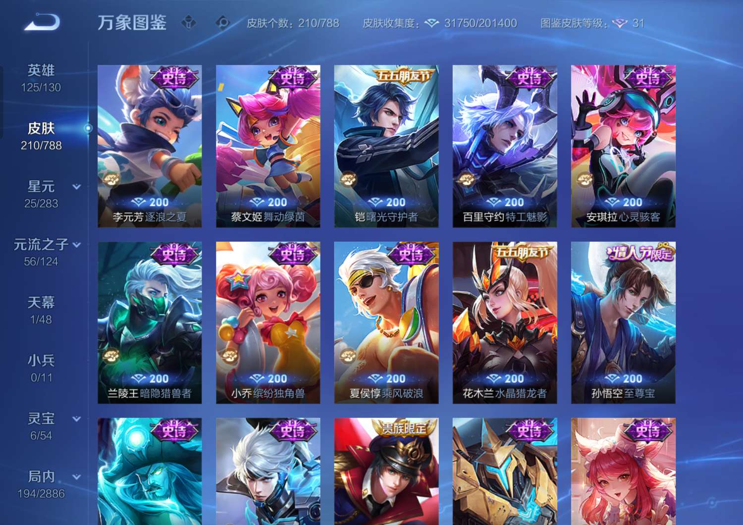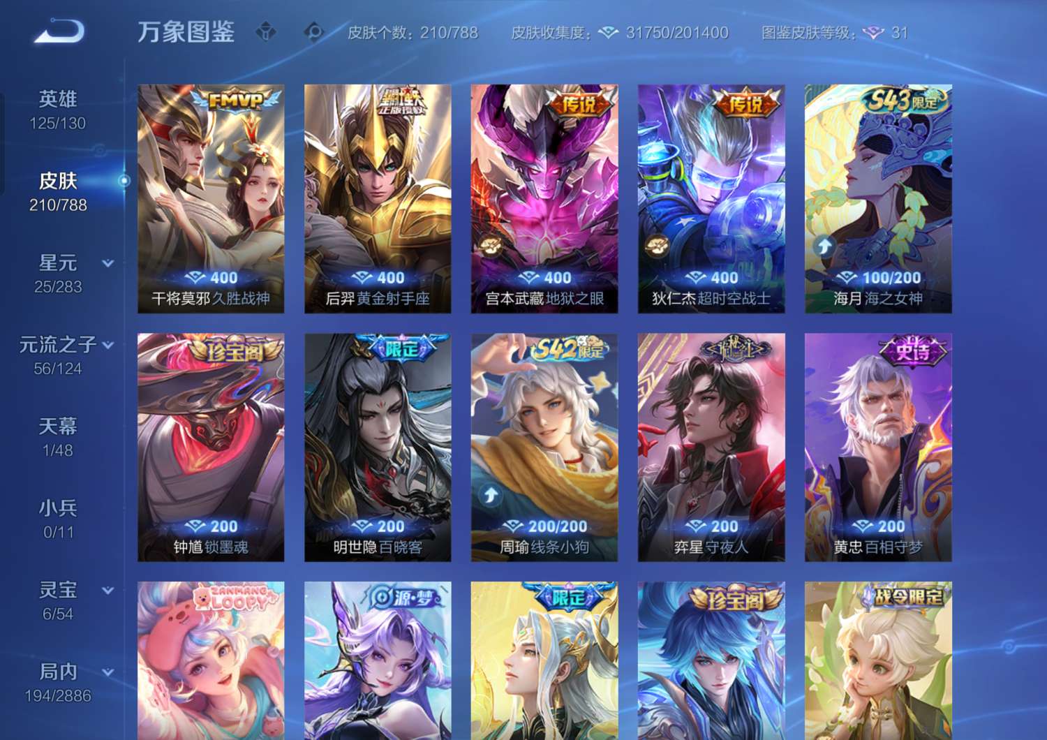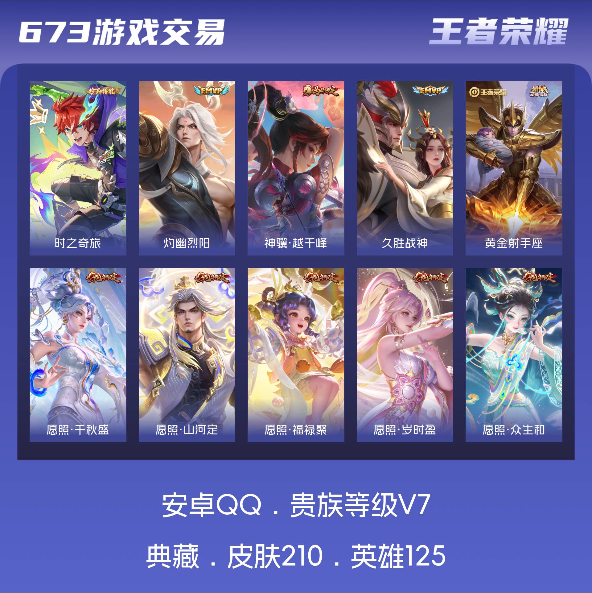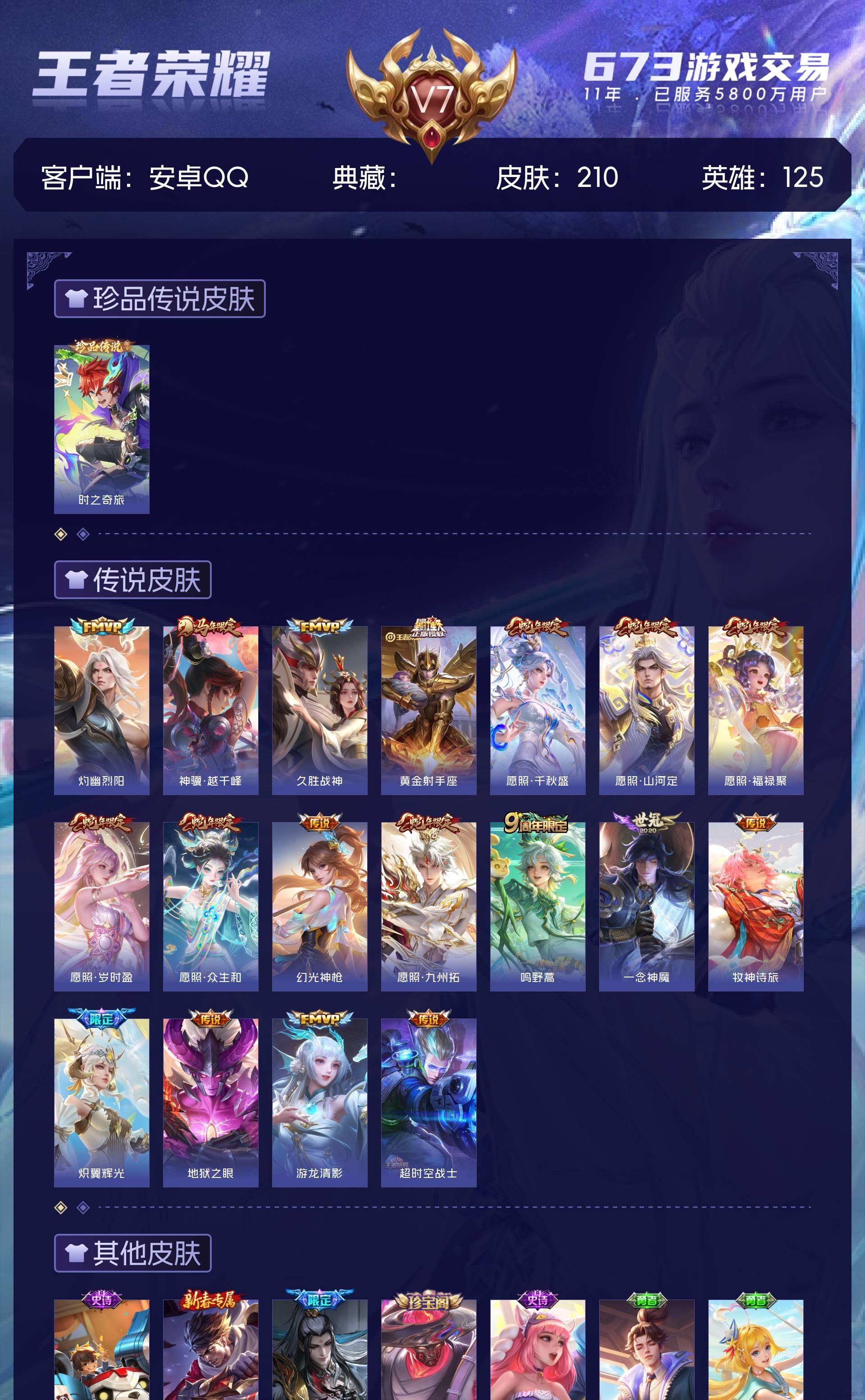 V7 皮肤210 英雄125 至尊星耀 珍品传说1 传说18