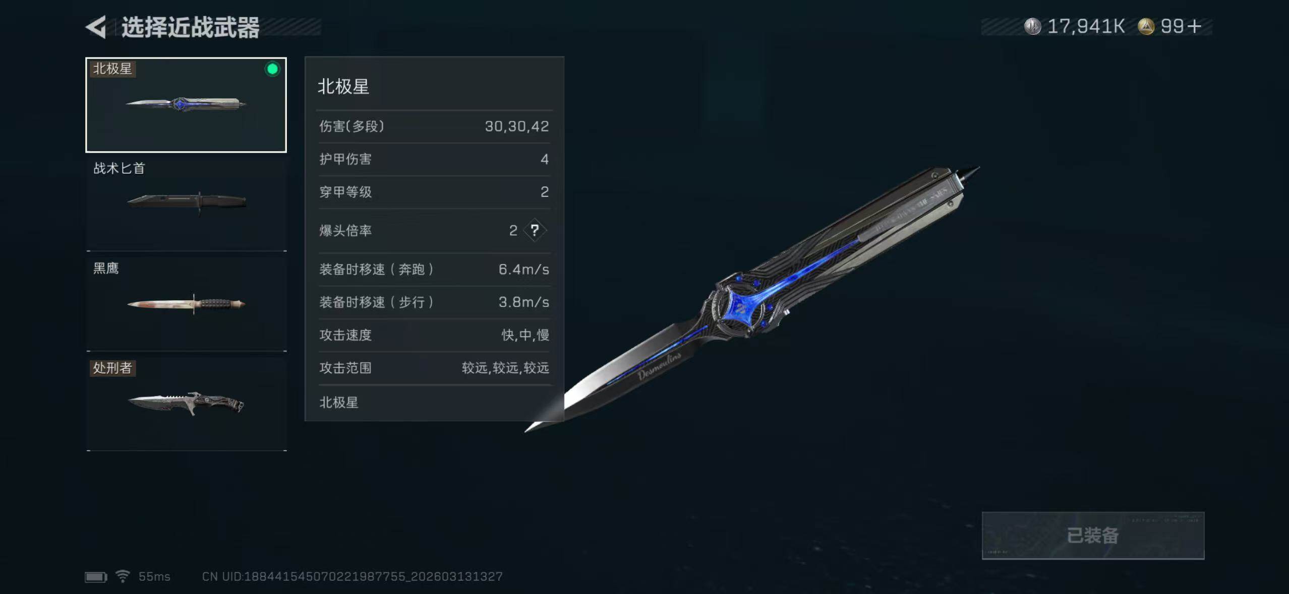 【近战皮肤】:近战-北极星,近战-处刑者1级,近战-黑鹰