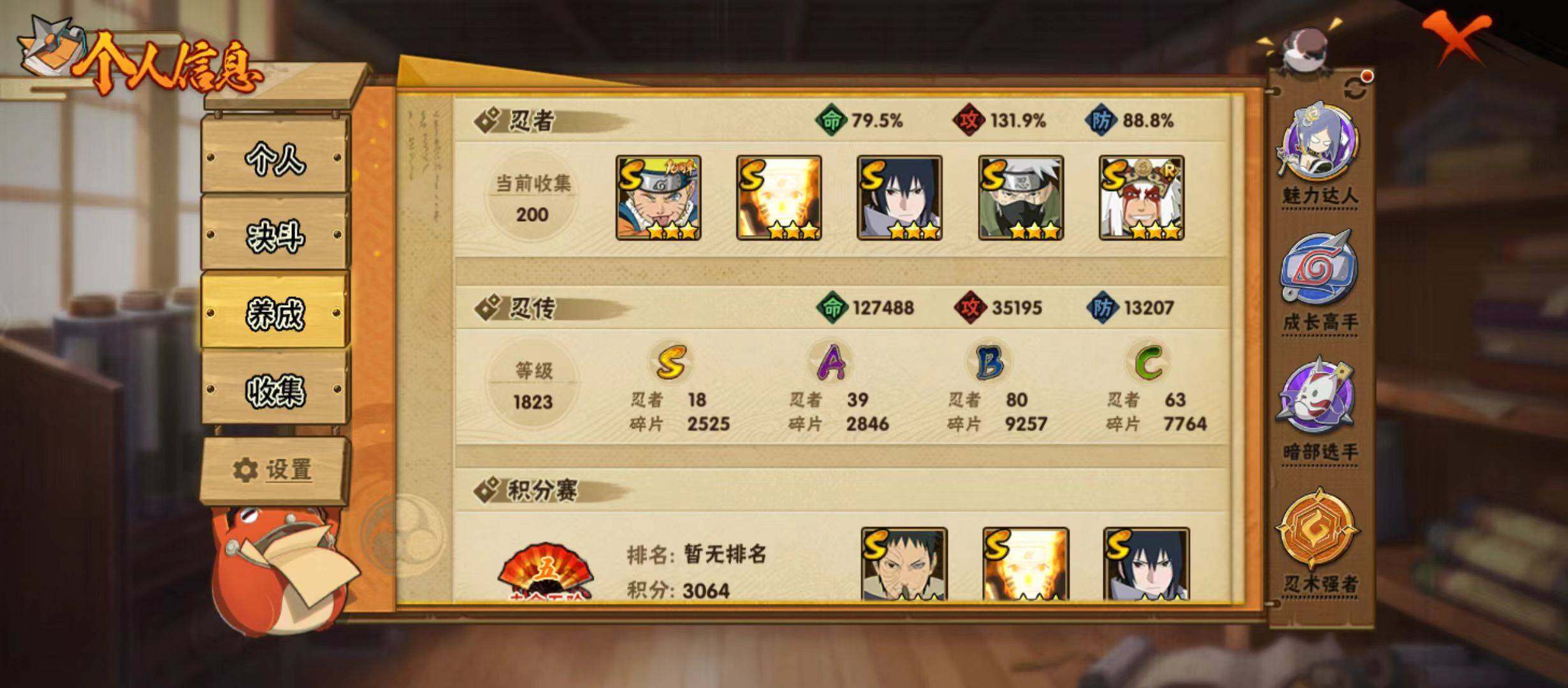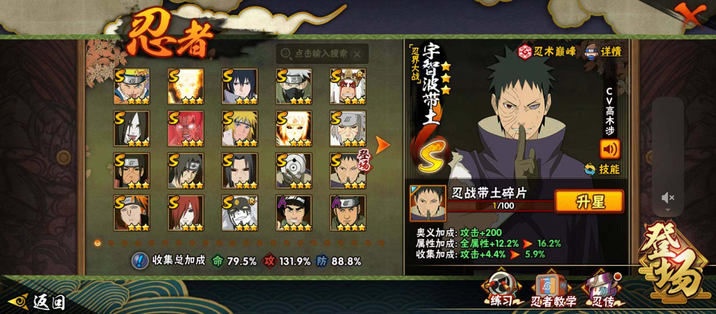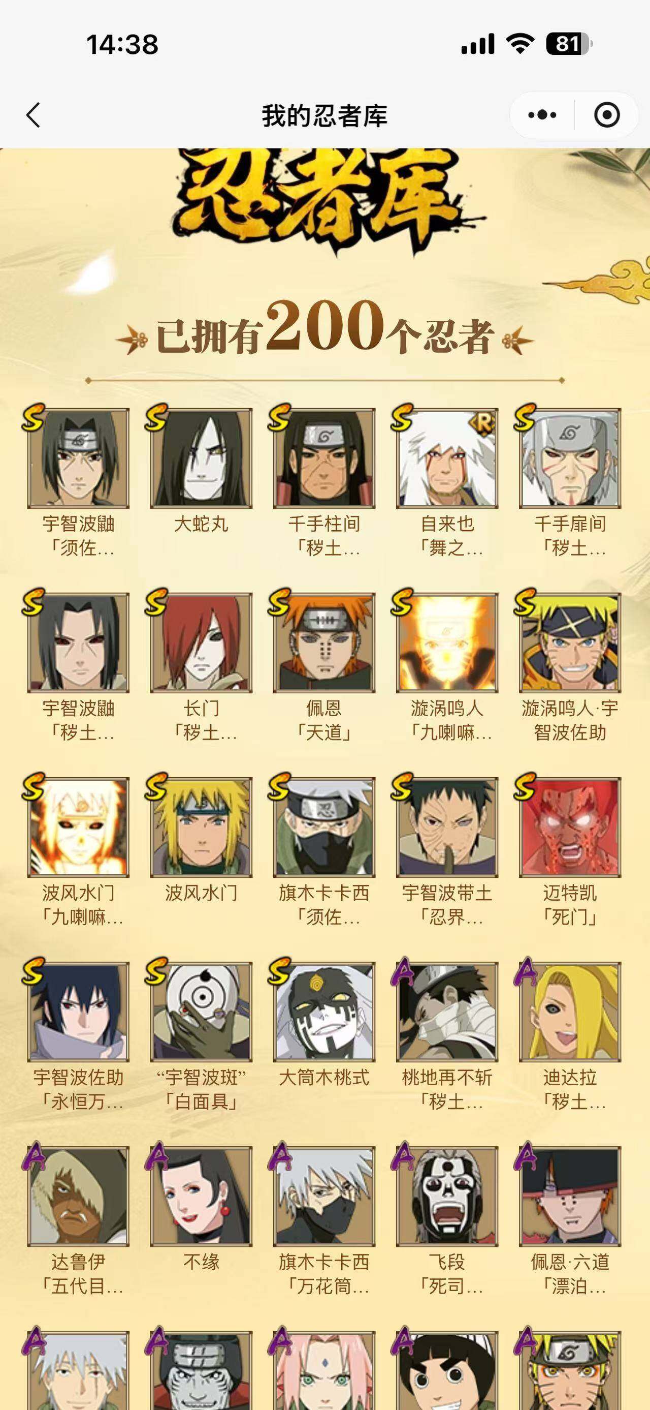 可改实名*18S级忍者数-39A级忍者数【S级忍者】:长门「秽土转生」(3星),千手扉间「秽土转生」(3星),千手柱间「秽土转生」(3星),宇智波鼬「秽土转生」(3星),宇智波带土「忍界大战」(3星),宇智波鼬「须佐能乎」(3星),旗木卡卡西「须佐能乎」(3星),自来也「舞之豪杰」(3星),大蛇丸(3星),波风水门(3星),漩涡鸣人「九喇嘛连结」(3星),迈特凯「死门」(3星),佩恩「天道」(3
