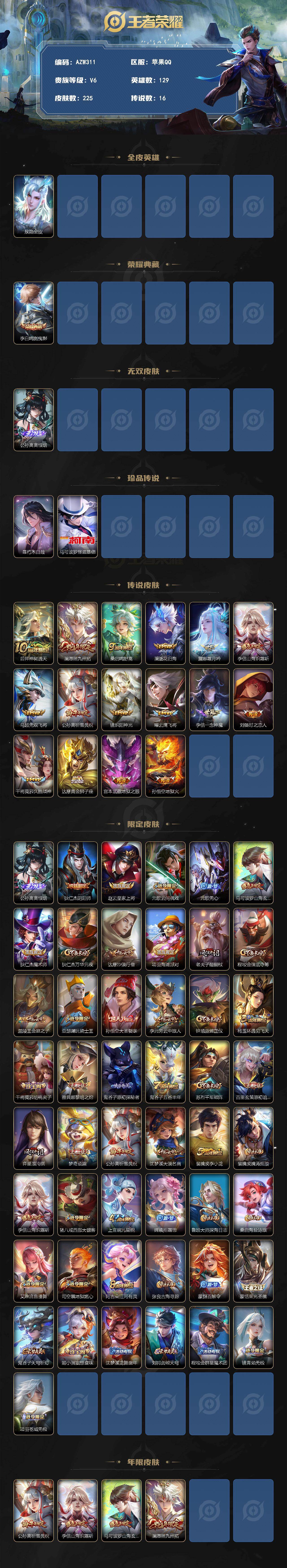 /【AZW311】苹果Q-V6-最强王者段位-129英雄-225皮肤-1典藏皮肤-1无双-2珍品传说-16传说-69史诗