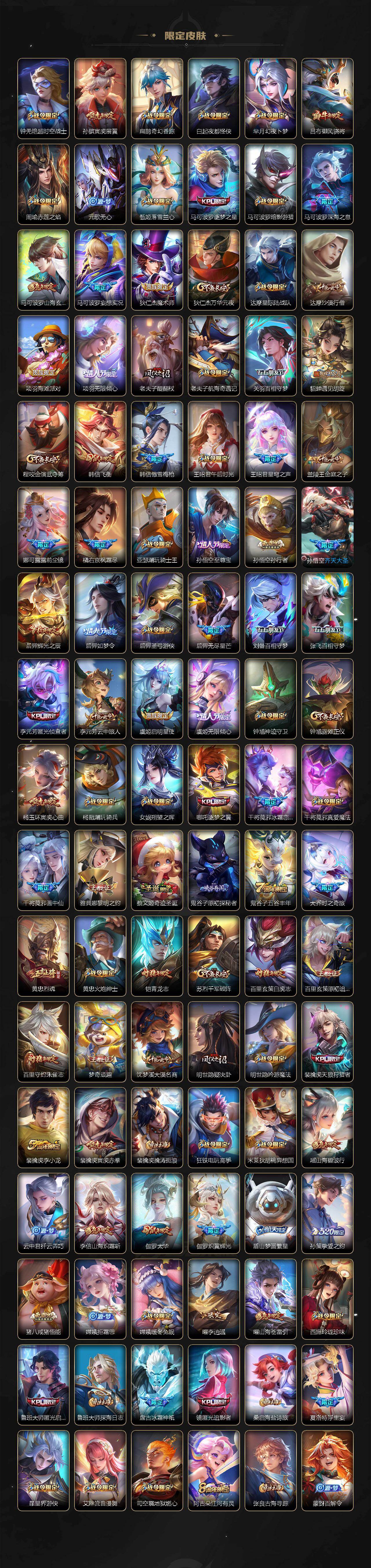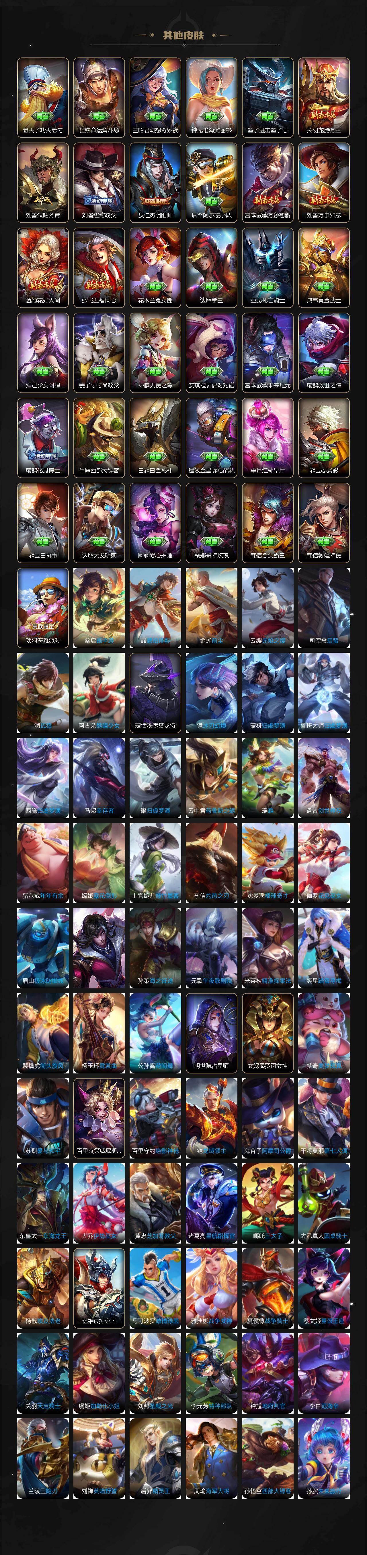 【英雄全皮】:廉颇全皮,刘禅全皮,李白全皮,马可波罗全皮,达摩全皮,司马懿全皮,姜子牙全皮,孙权全皮,朵莉亚全皮,娜可露露全皮,橘右京全皮,后羿全皮,刘备全皮,钟馗全皮,苍全皮,哪吒全皮,鬼谷子全皮,百里玄策全皮,百里守约全皮,李信全皮,大司命全皮,马超全皮,敖隐全皮,海月全皮,曜全皮,鲁班大师全皮,蒙恬全皮,澜全皮,盘古全皮,镜全皮