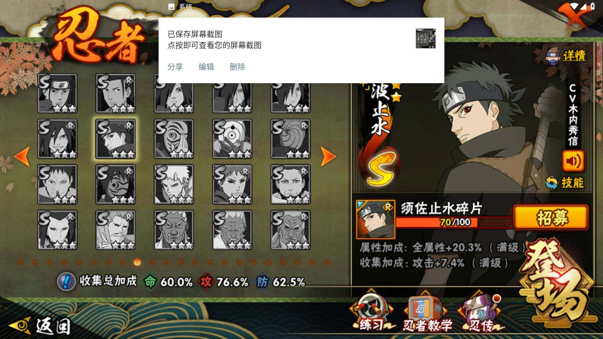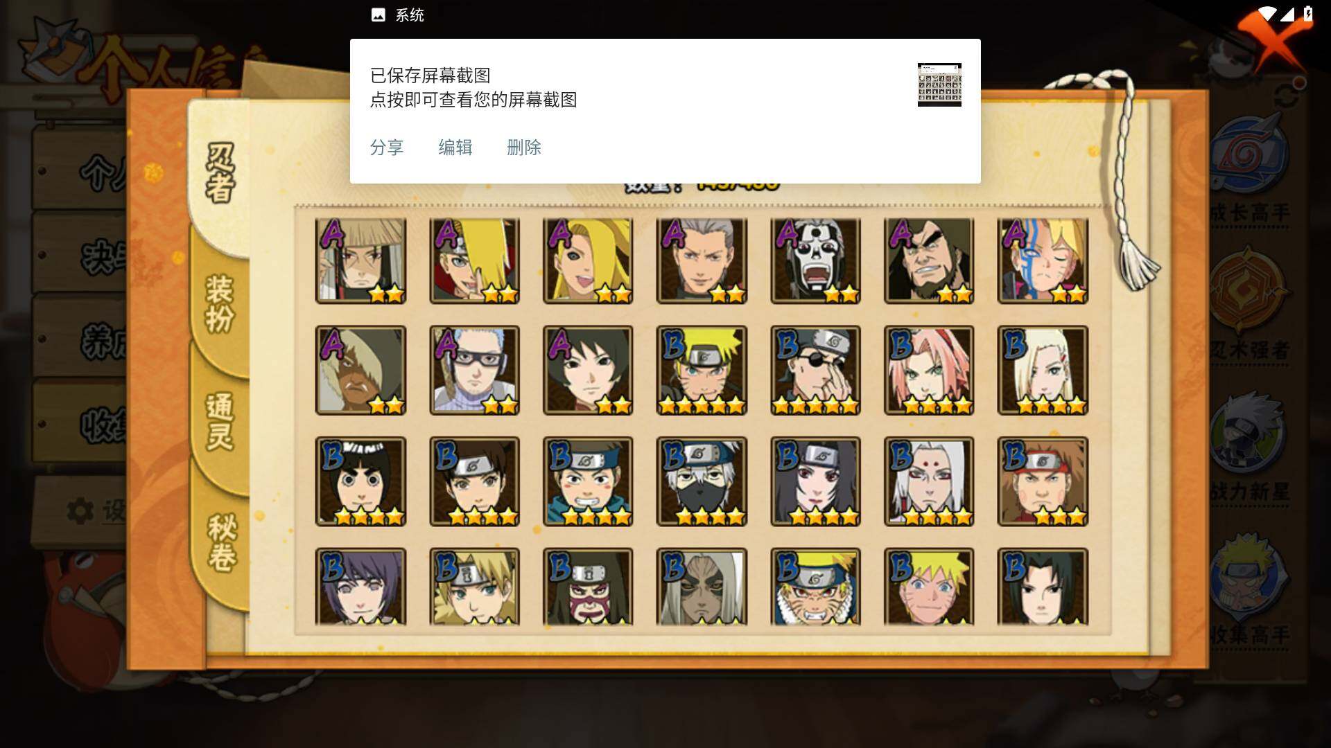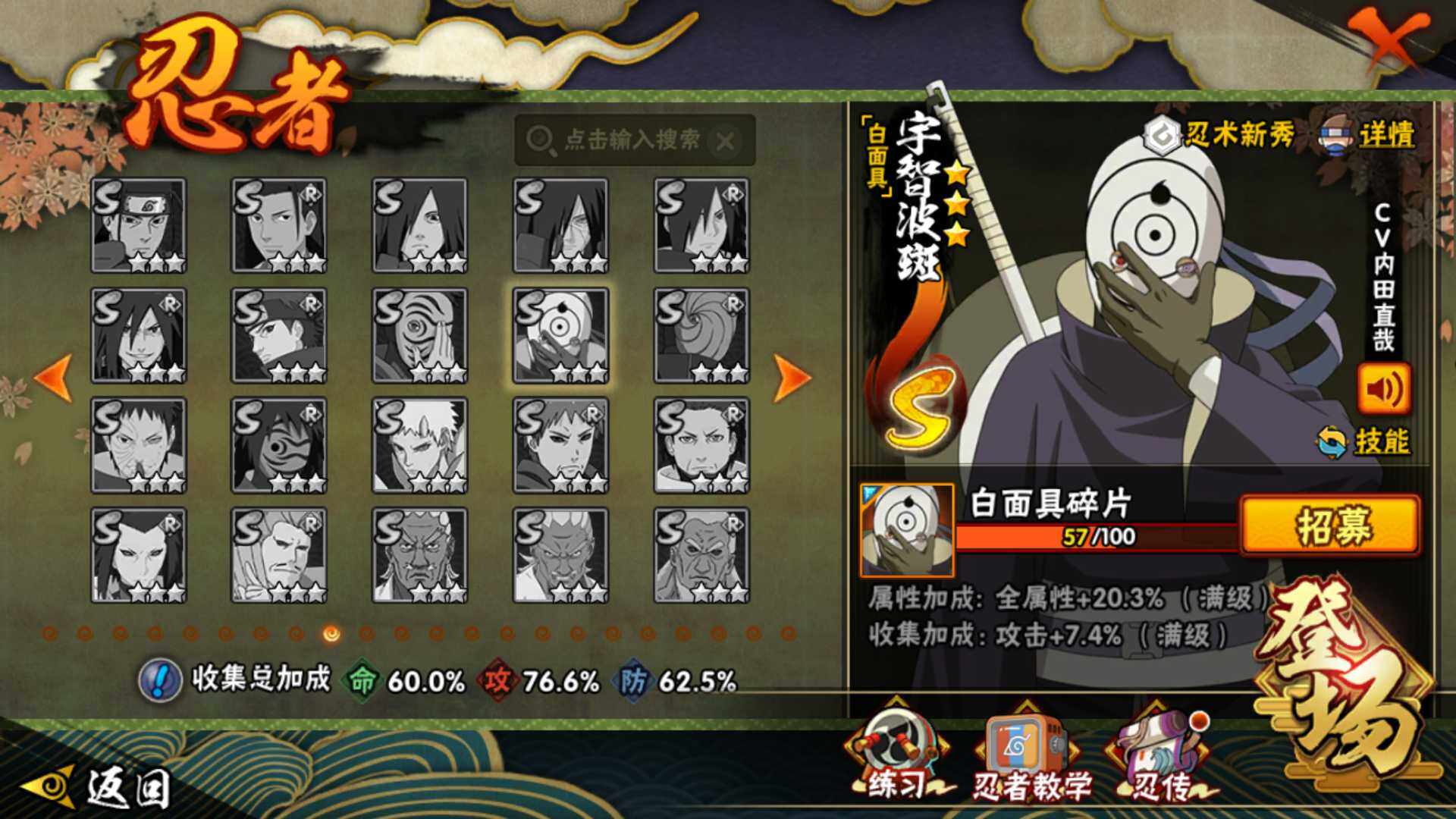 【S级忍者】:千手柱间「秽土转生」(3星),宇智波鼬「秽土转生」(3星),宇智波斑「秽土转生·解」(3星),宇智波鼬「须佐能乎」(3星),自来也「舞之豪杰」(3星),大蛇丸(3星),波风水门(3星),漩涡鸣人「九喇嘛连结」(3星),迈特凯「死门」(3星),佩恩「天道」(3