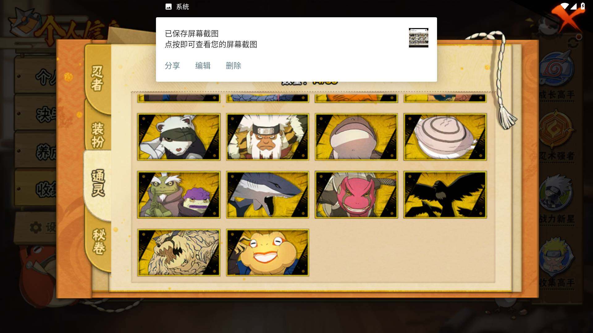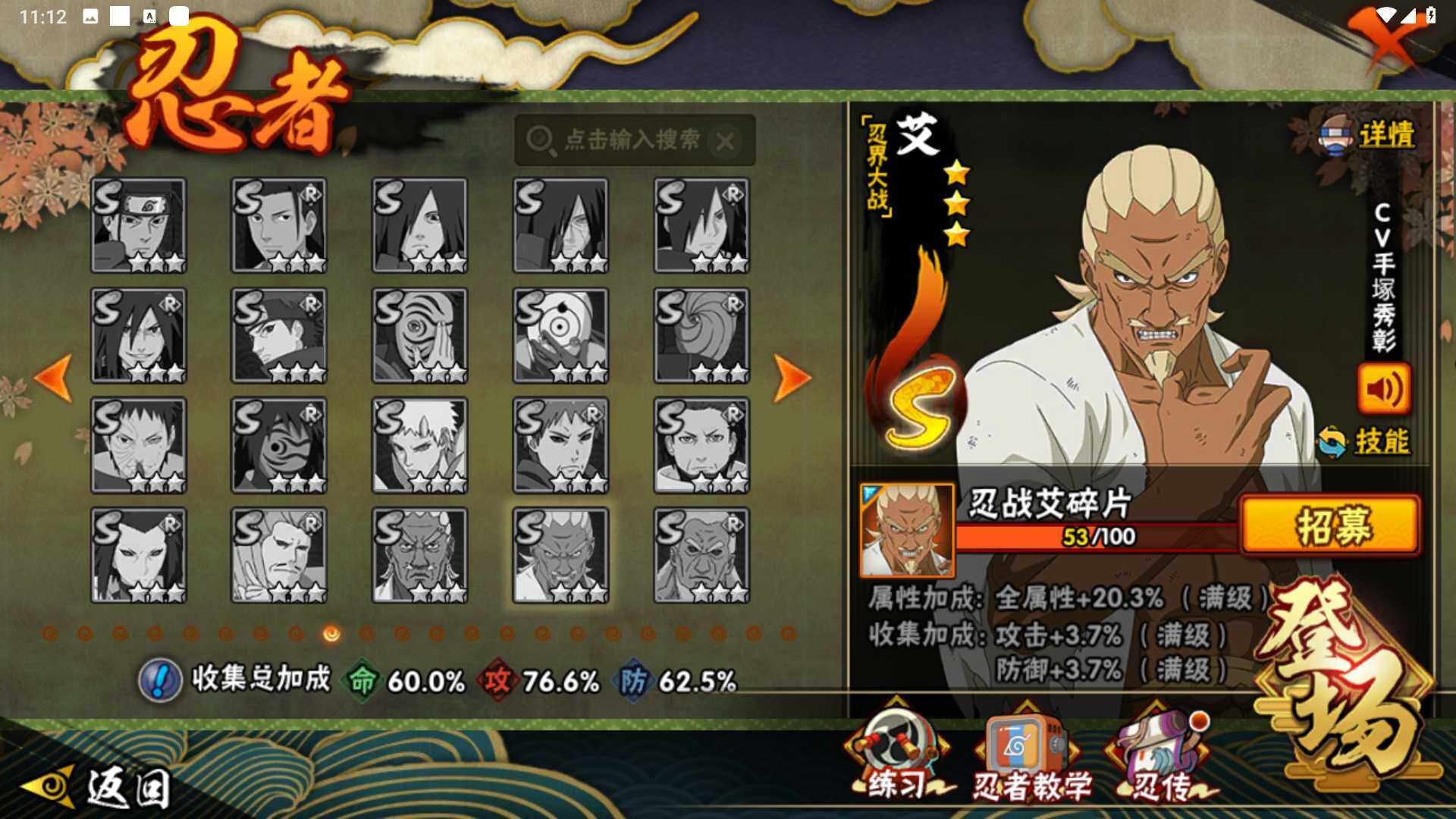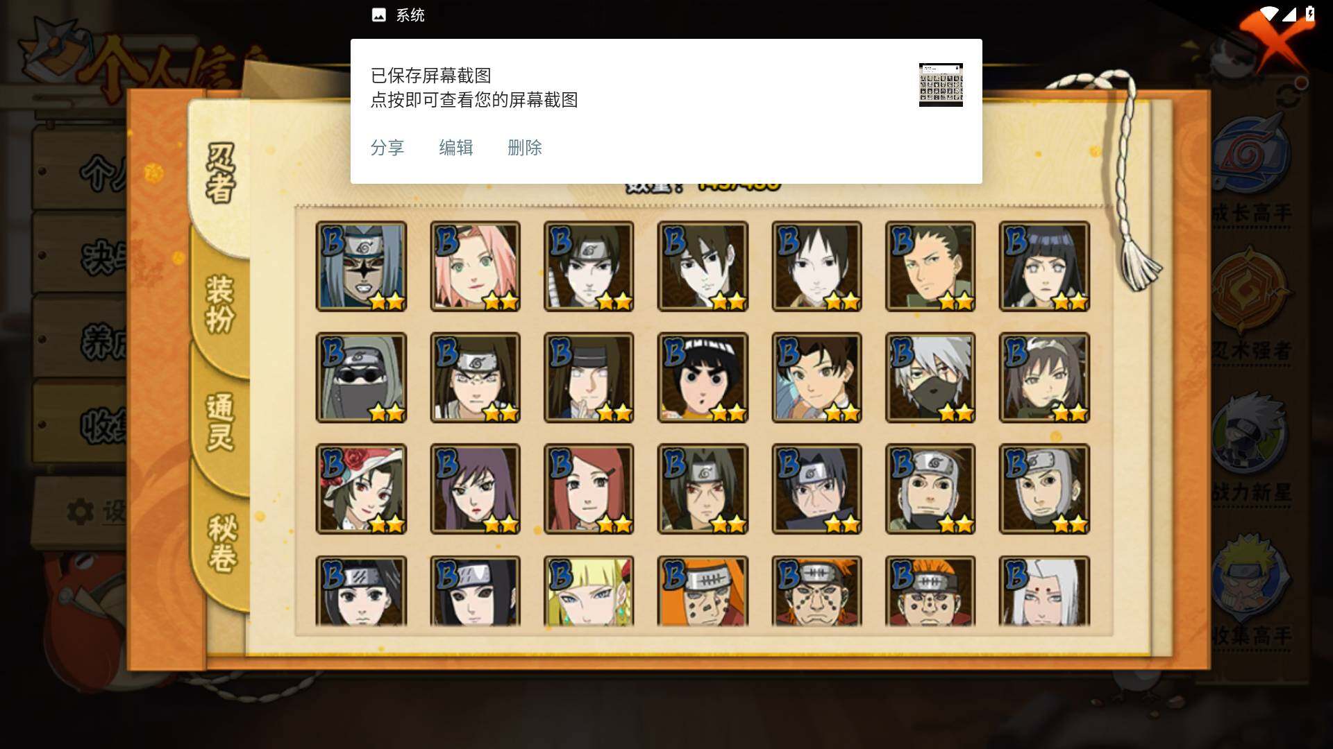 【S级忍者】:千手柱间「秽土转生」(3星),宇智波鼬「秽土转生」(3星),宇智波斑「秽土转生·解」(3星),宇智波鼬「须佐能乎」(3星),自来也「舞之豪杰」(3星),大蛇丸(3星),波风水门(3星),漩涡鸣人「九喇嘛连结」(3星),迈特凯「死门」(3星),佩恩「天道」(3