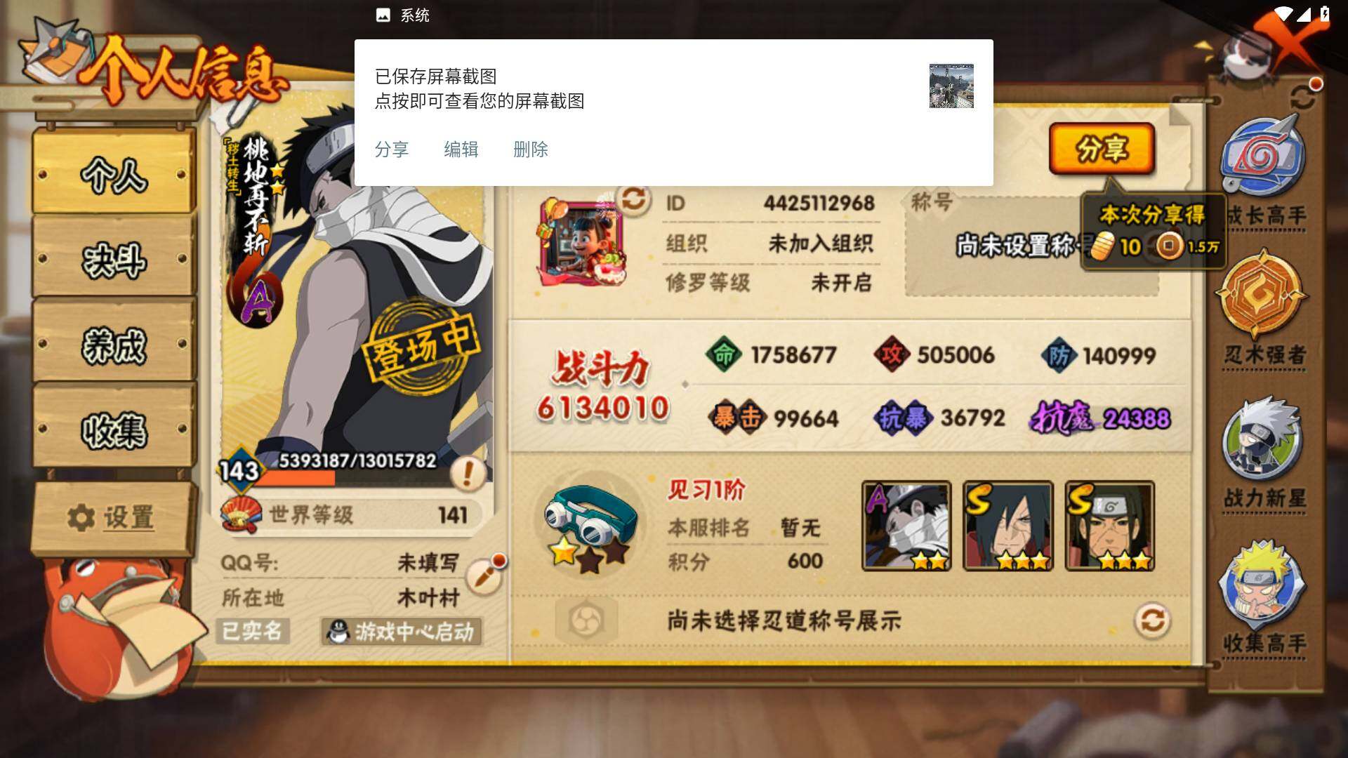(可免费转苹果)v4 613万战力 11S 27A 17000金币 白面具57片 须佐止水70片 忍战艾53片 zp3554