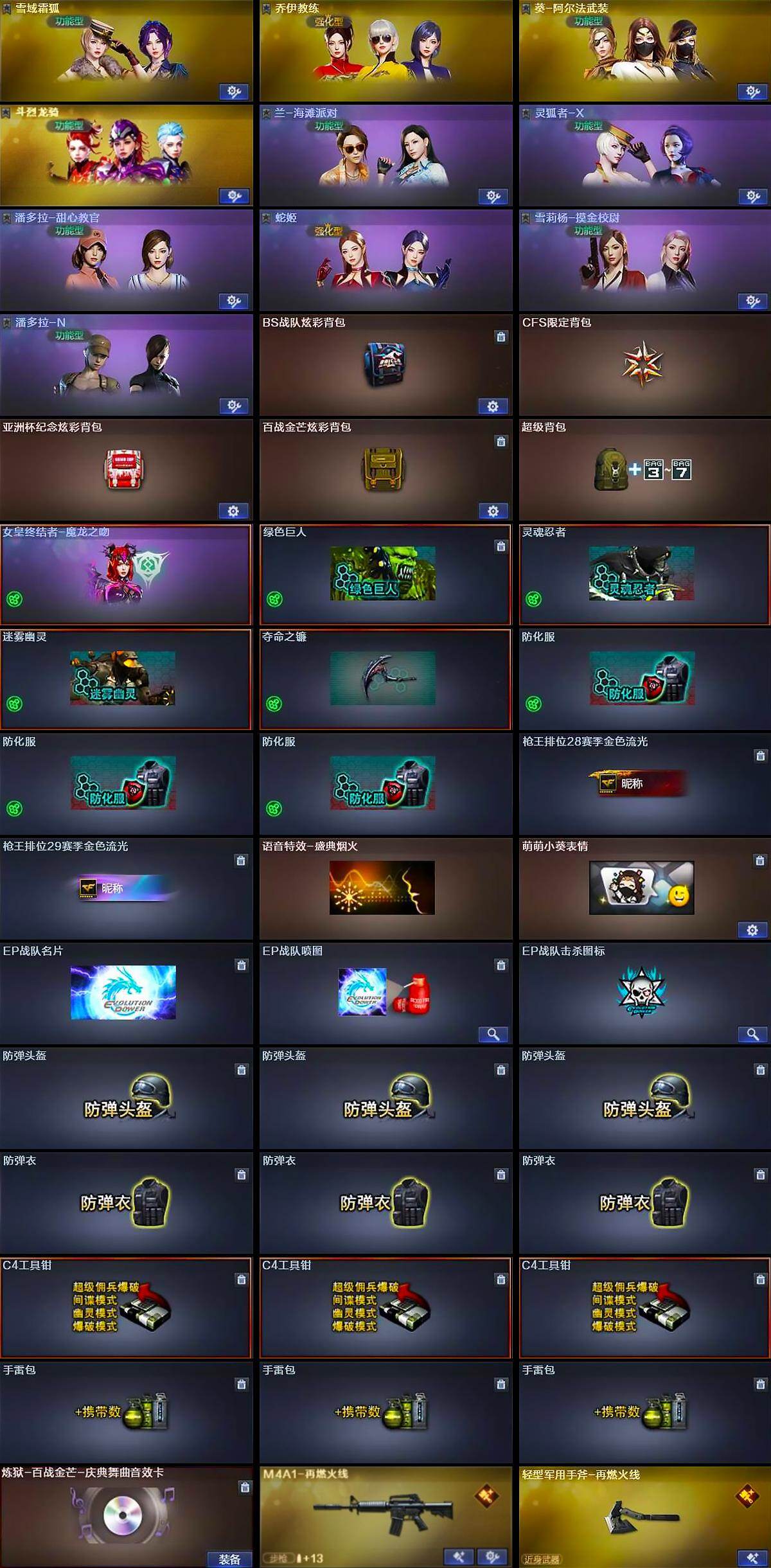 河北一区-17V-0王者武器数-0炫金武器数【传说武器】:传说幽瞳【热门武器】:传说幽瞳【音效卡】:炼狱-百战金芒-庆典舞曲音效卡【皮肤】:M4A1-再燃火线,轻型军用手斧-再燃火线【角色】:雪域霜狐,乔伊教练,葵-阿尔法武装,斗烈龙骑,兰-海滩派对,0号玩家,灵狐者-X,潘多拉-甜心教官,蛇姬,兔囡囡,雪莉杨-摸金校尉,潘多拉-N【英雄级武器】:M4A1-玫瑰精灵,机械迷城-穹宇,AWM-裁决,炼狱-百战金芒,麒麟刺-百战金芒,屠龙-斗烈龙驹,高爆手雷-玄豹,闪光弹-玄豹,烟雾弹-雷暴,烟雾弹