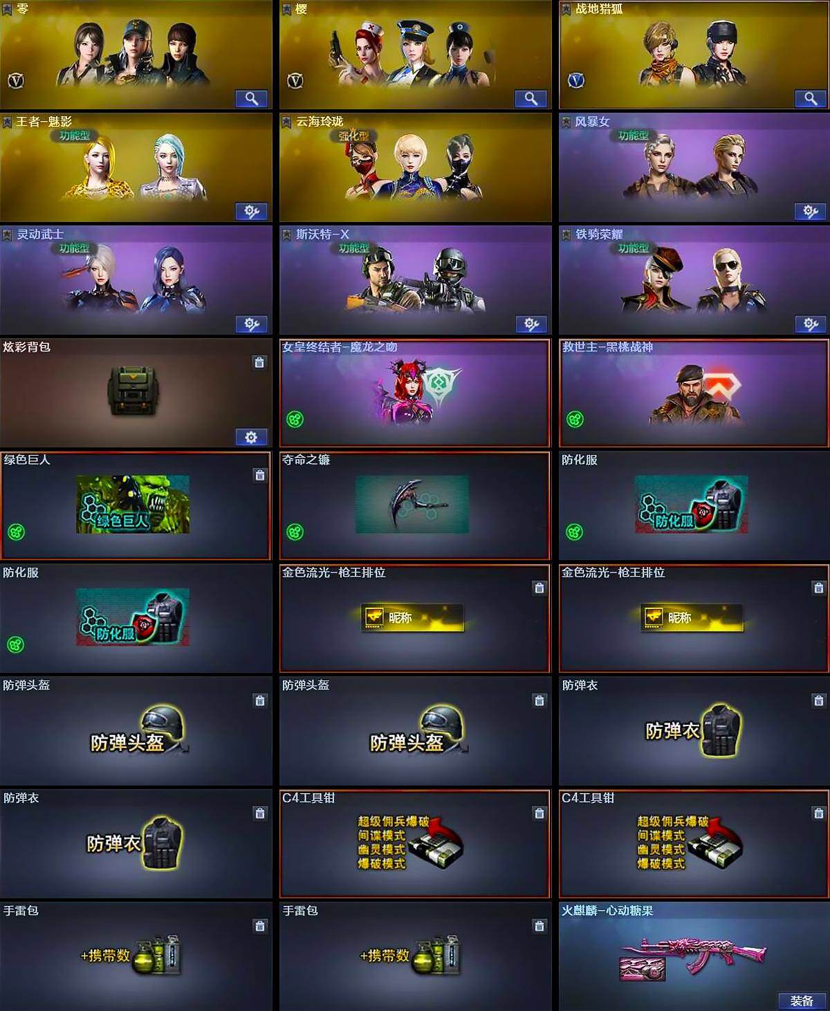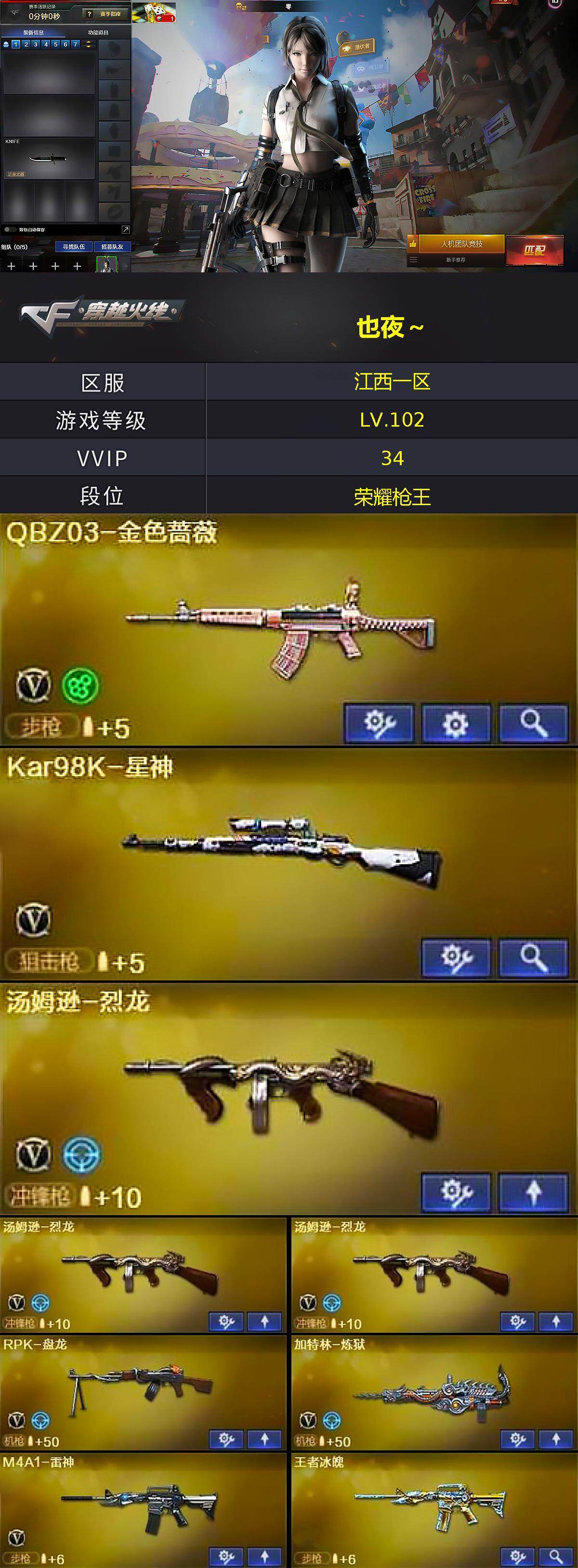 江西一区-35V-5王者武器数-1炫金武器数【热门武器】:QBZ03-金色蔷薇,HK417-朱雀,Kar98K-星神,M4A1-黑骑士*2,汤姆逊-烈龙*3,RPK-盘龙,加特林-炼狱,沙鹰-修罗*5【王者炫金武器】:王者冰魄,王者之心*2,王者之魄闪光弹,炫金武士【皮肤】:火麒麟-心动糖果【角色】:零,樱,战地猎狐,王者-魅影,云海玲珑,风暴女,灵动武士,斯沃特-X,铁骑荣耀【人偶武器】:迷你深渊冰龙*4,迷你裂空之翼【暴走生化】:超级对讲机【挑战大师】:致命乱世-超越Max,冰龙粉碎者-白马