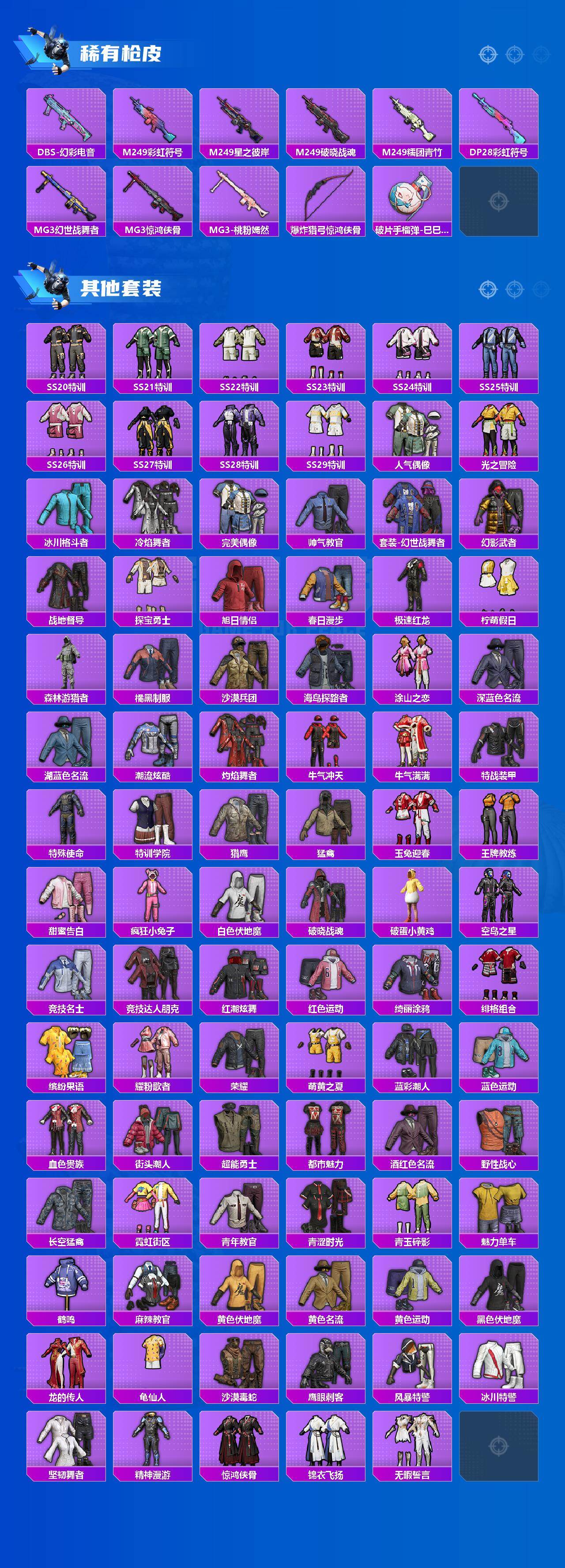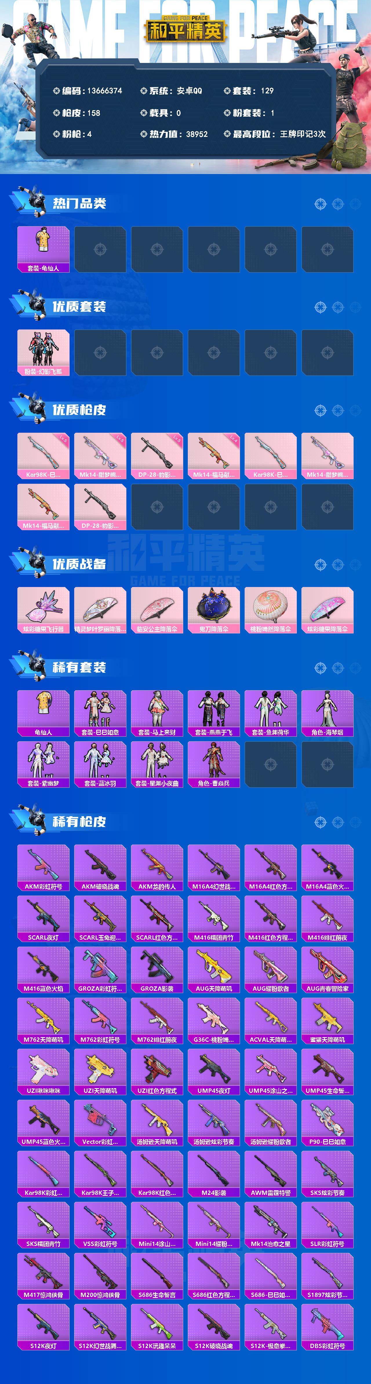 129套装/枪械4/装备144/战备103/王牌印记3/热力值38952/五级Kar98K-巳巳如意/五级Mk14-甜梦熊击/四级Mk14-福马献瑞/五级DP-28-豹影疾电/套装-龟仙人/幻影飞狐/Kar98K-巳巳如意/Mk14-甜梦熊击/Mk14-福马献瑞/DP-28-豹影疾电/炫彩糖果飞行器/精灵梦叶罗丽降落伞/临安公主降落伞/鬼刀降落伞/桃粉嫣然降落伞/炫彩糖果降落伞/龟仙人/巳巳如意