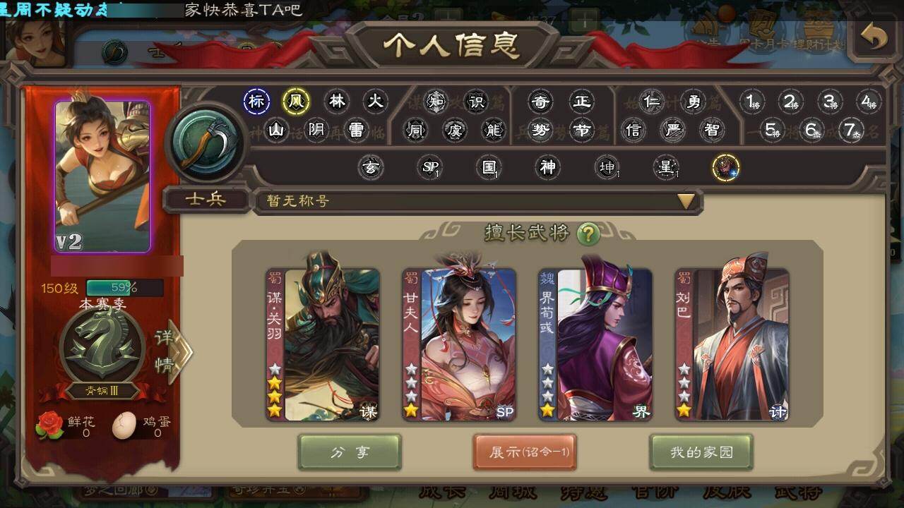 官阶:先锋将军;VIP等级:VIP2;史诗武将数量:1;动态皮肤数量:0;武将