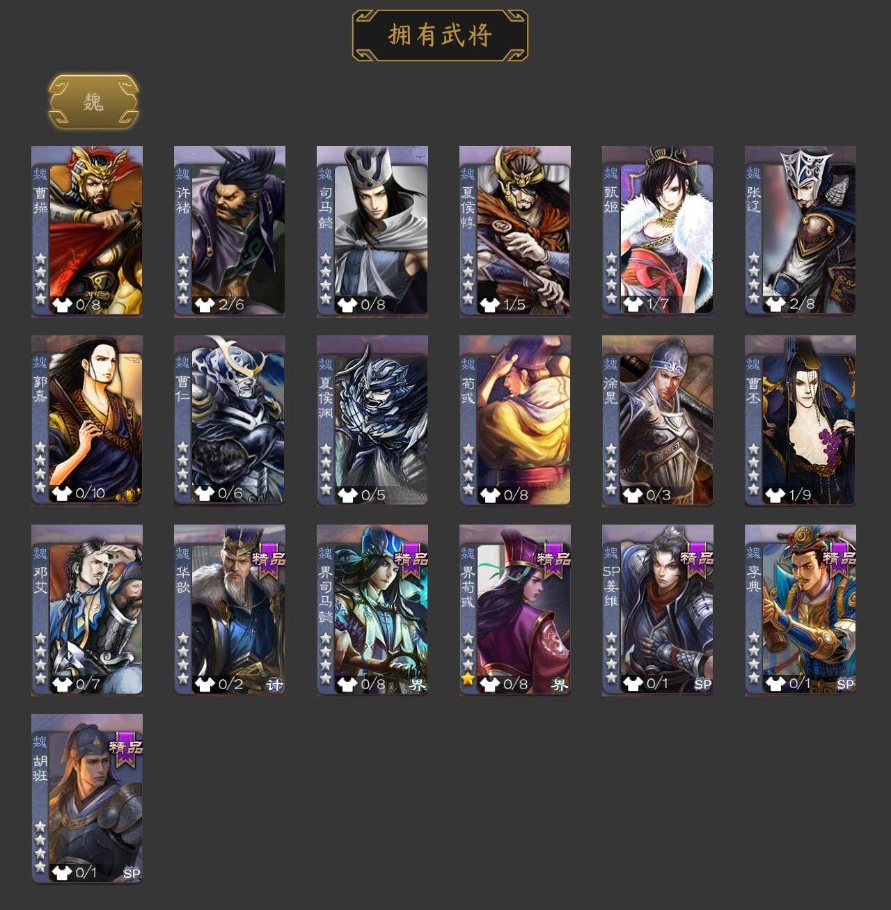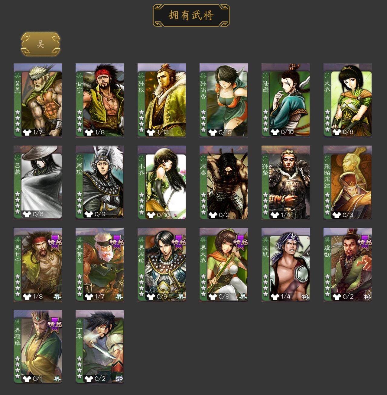 谋关羽,SP姜维,界司马懿,李典,界荀彧,华歆,胡班,夏侯霸,关兴张苞,界赵云,界马超,SP徐庶,张松,刘巴,虞翻,界甘宁,界黄盖,界周瑜,界大乔,界顾雍,友徐庶,伏完,伏皇后,华雄,袁术,
