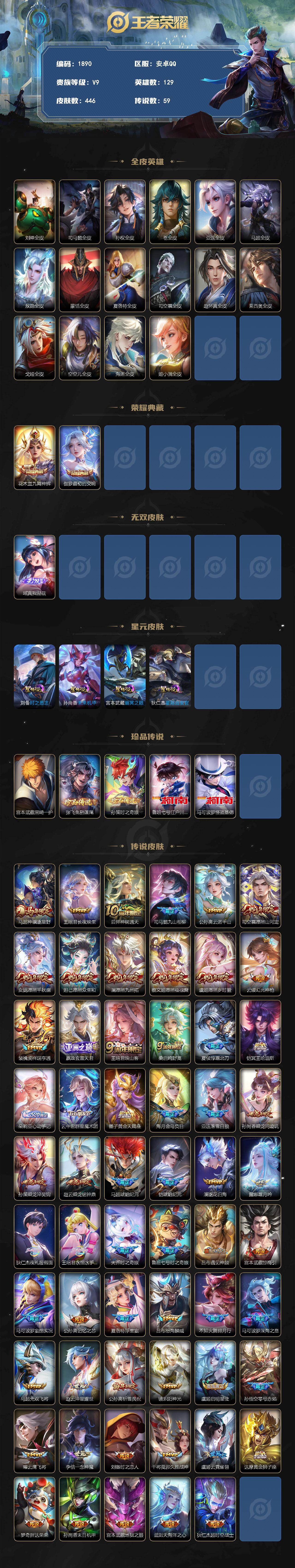 安卓Q-V9-永恒钻石I段位-129英雄-446皮肤-2典藏皮肤-1无双-5珍品传说-59传说-153史诗