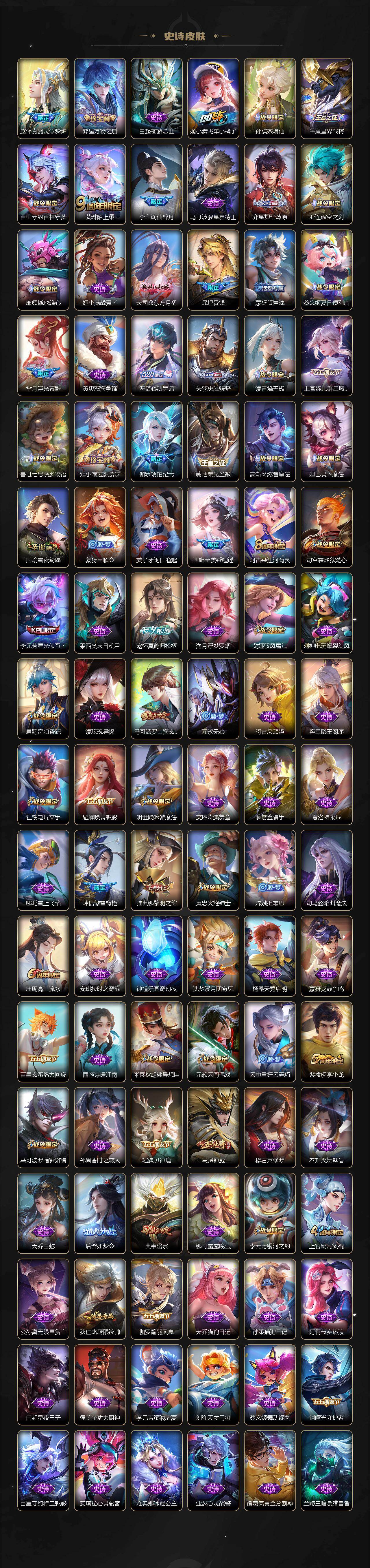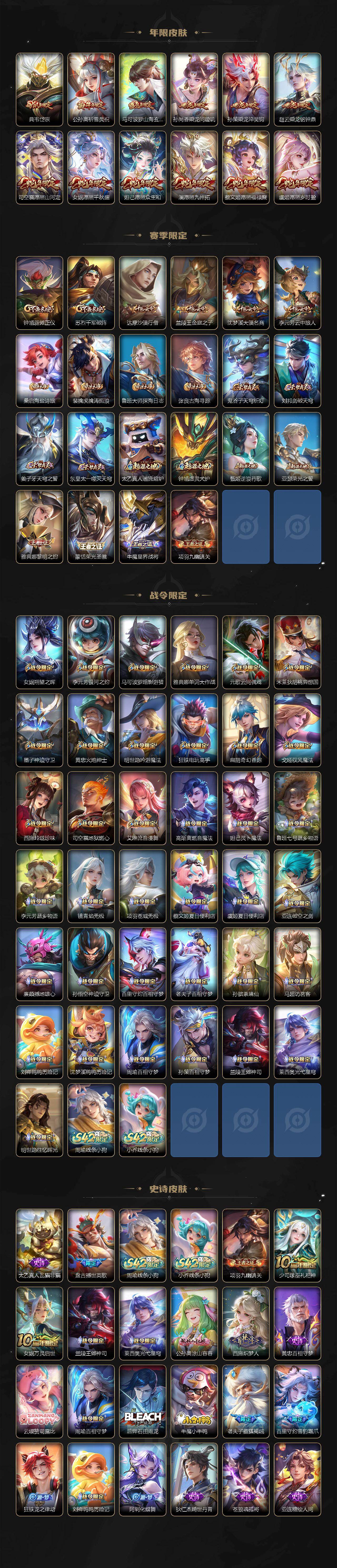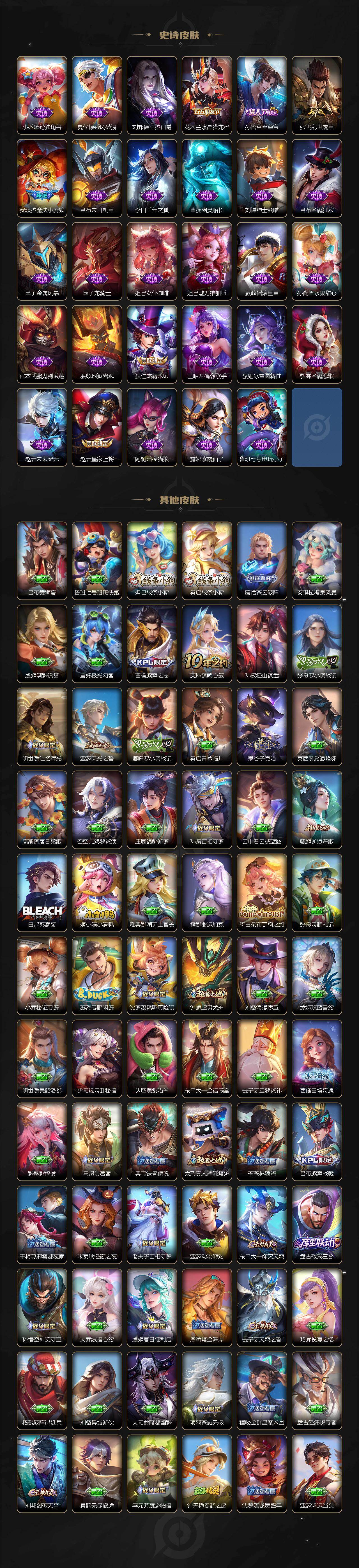 【英雄全皮】:刘禅全皮,司马懿全皮,孙权全皮,苍全皮,亚连全皮,马超全皮,敖隐全皮,蒙恬全皮,夏洛特全皮,司空震全皮,赵怀真全皮,莱西奥全皮,戈娅全皮,空空儿全皮,海诺全皮,姬小满全皮