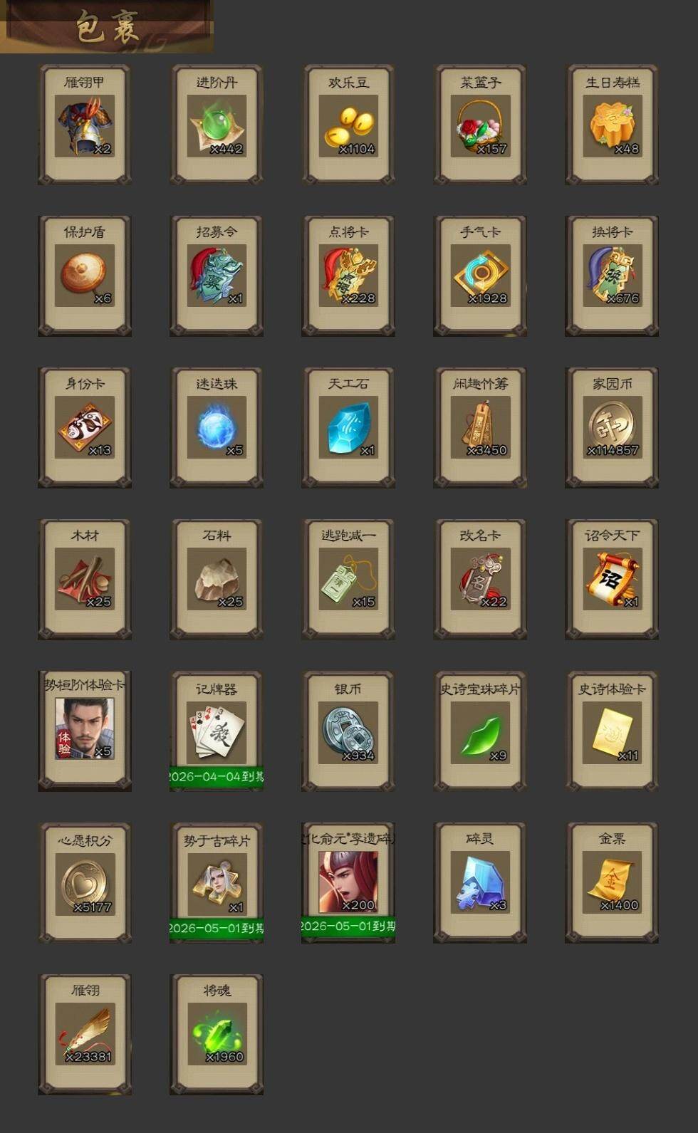 官阶:骠骑将军;VIP等级:VIP3;史诗武将数量:13;动态皮肤数量:12;武将总数:234;史诗宝珠数量:0;将魂数量:1960;神将:1;魏国史诗武将:10;蜀国史诗武将:1;吴国史诗武将:0;群史诗武将:4