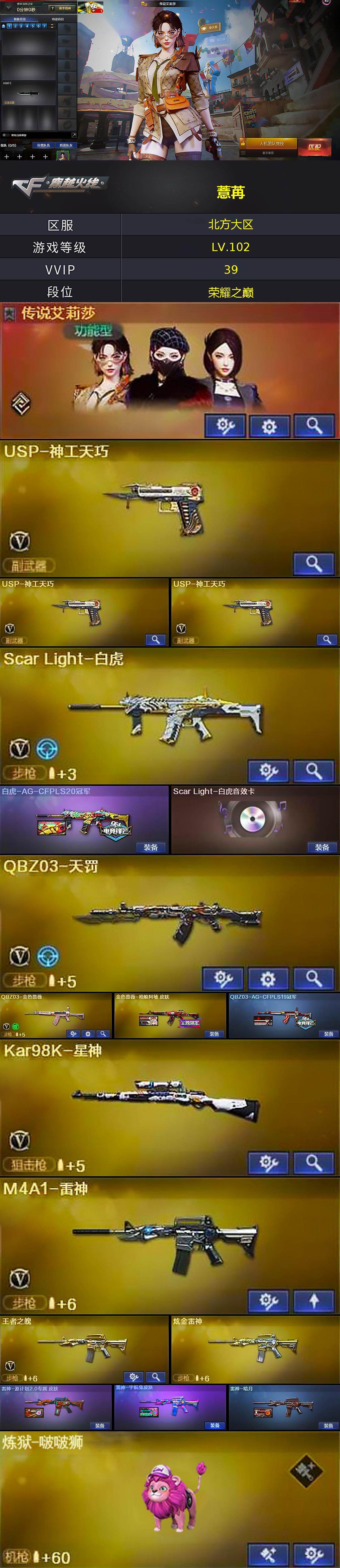 【ky6723】北方大区-43V-24王者武器数-2炫金武器数【传说角色】:传说艾莉莎【热门武器】:QBZ03-金色蔷薇,Scar Light-白虎,Kar98K-星神,M4A1-黑骑士,COP-白鲨,沙鹰-修罗*2【王者炫金武器】:王者青龙,王者之霆,王者玉锋,王者之魄高爆手雷*5,王者之魄闪光弹*5,王者之魄烟雾弹*5,炫金火麒麟,炫金雷神【音效卡】:屠龙-电竞之星-竞星跃动音效卡,AK47-火麒麟音效卡,M4A1-黑骑士音效卡,Scar Light-白虎音效卡,Barrett-碧霄极光音效