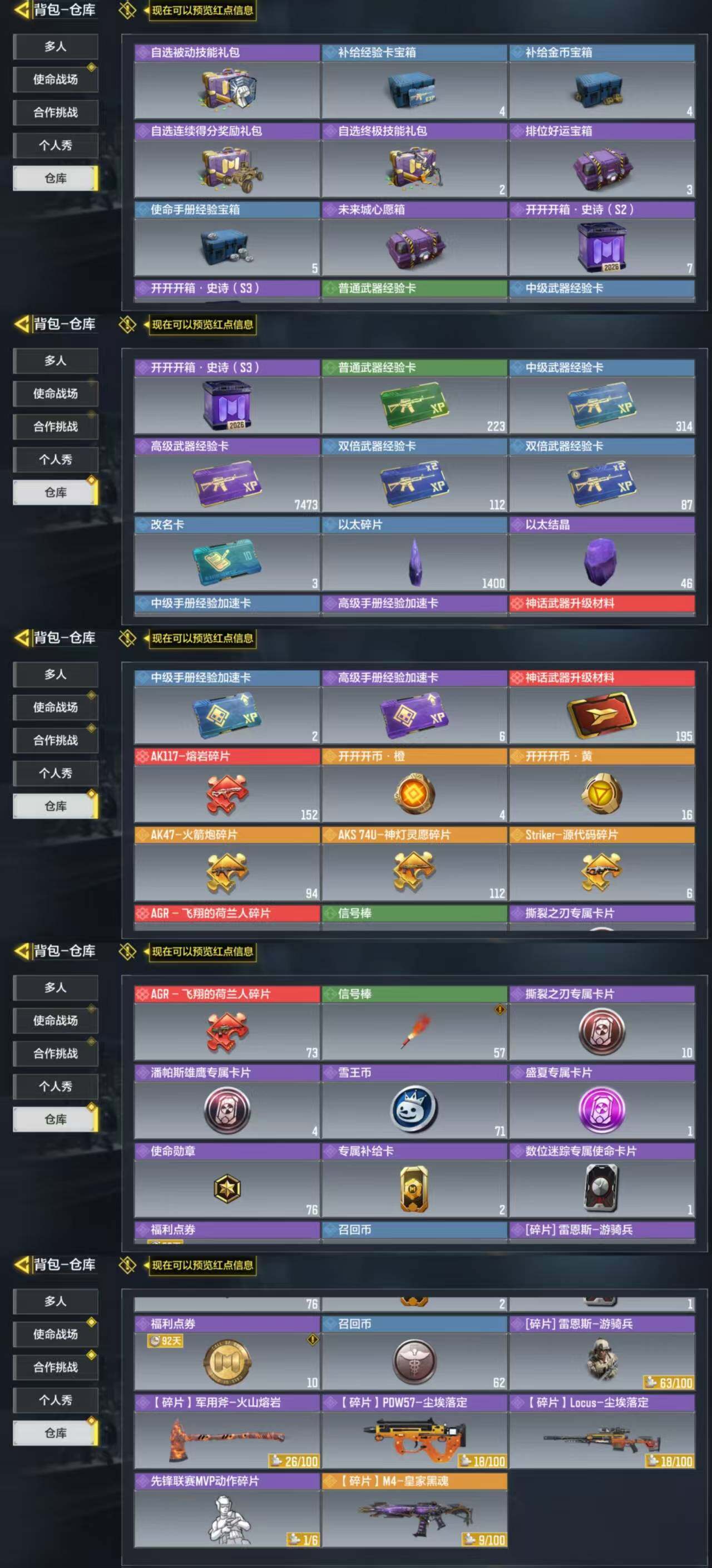 ae84,2神话无境空刃暗夜奏鸣曲,5传说皇家黑魂冥界提灯狂暴冲锋一路悠扬源代码,紫皮枪201紫载具24紫角色50,Kilo141-暗夜奏鸣曲,FFAR 1-无境空刃,M4-皇家黑魂,RPD-一路悠扬 ,Striker-源代码,Holger26-冥界提灯