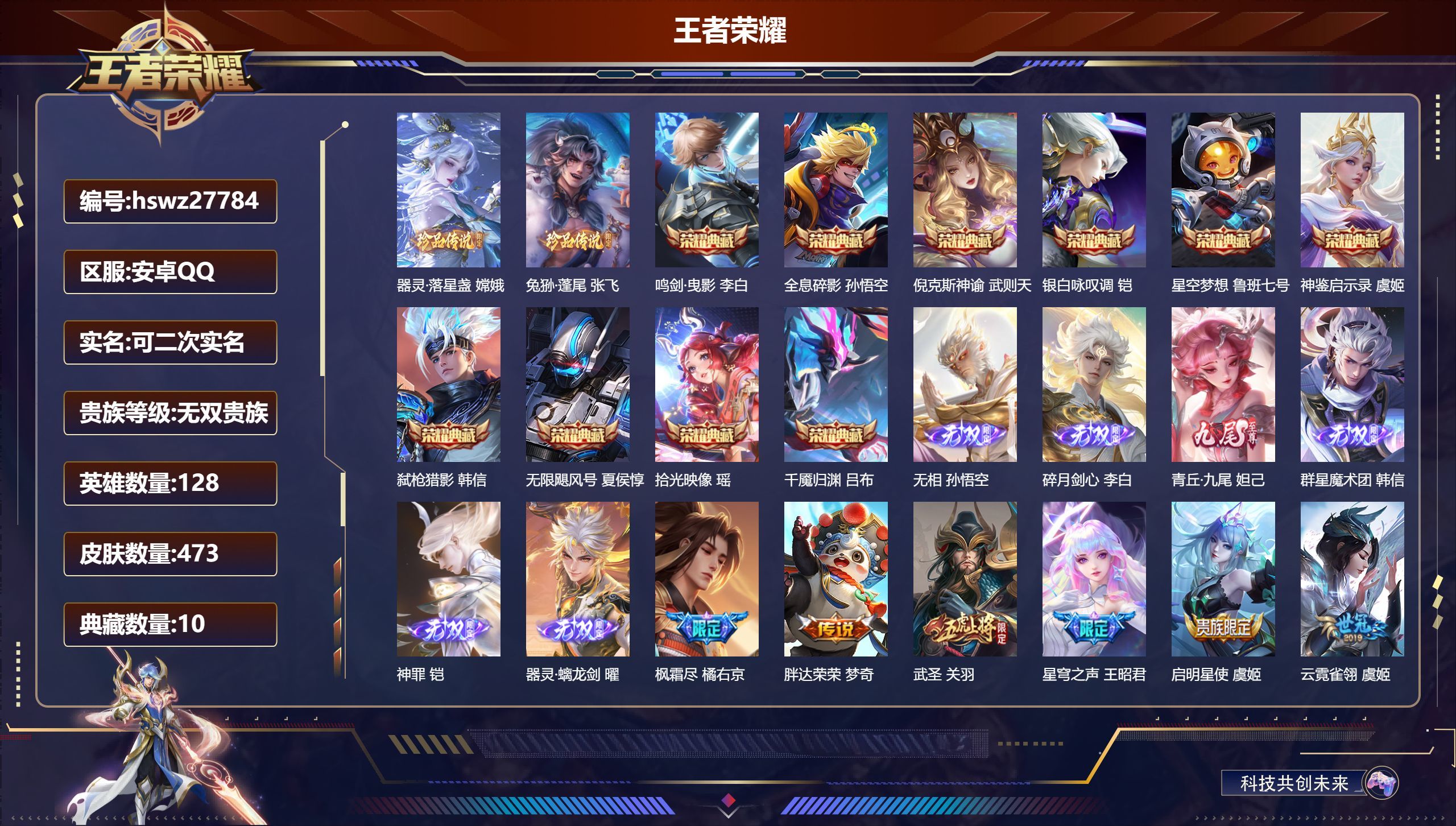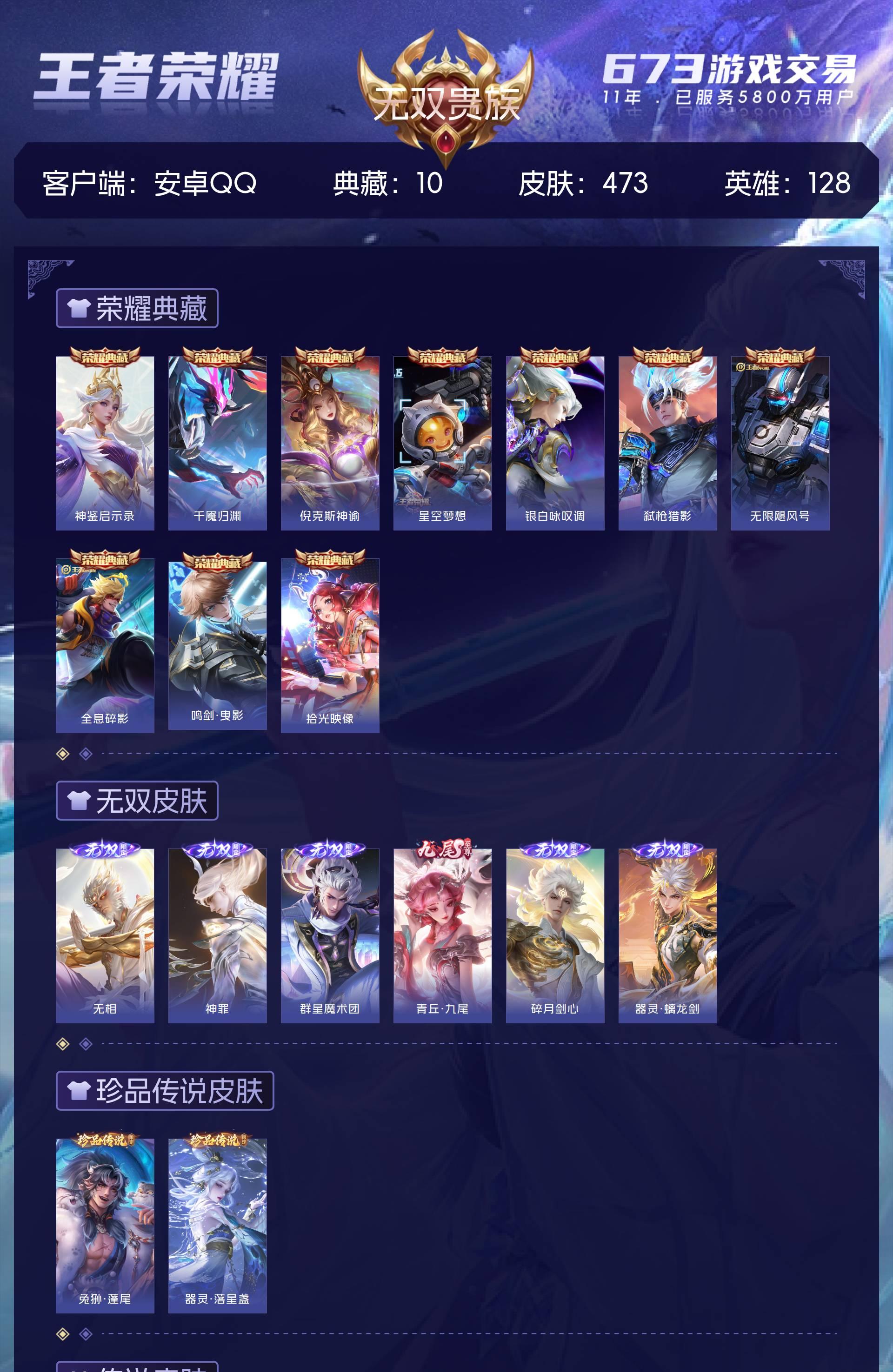 安卓QQ/最强王者/473皮肤/128英雄/10典藏/0珍品无双/6无双/2珍品传说/68传说/15