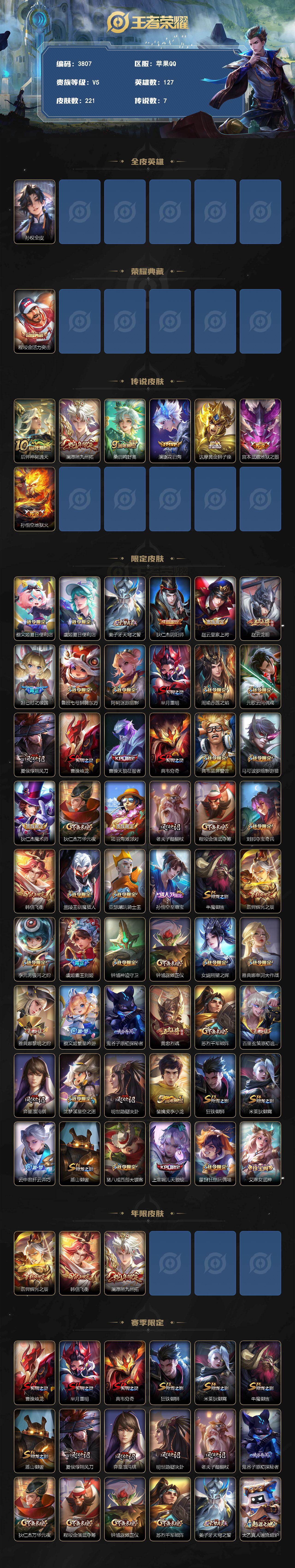 /wj【秒登录,秒换绑定】苹果Q-V5-最强王者段位-127英雄-221皮肤-1典藏皮肤-7传说-63史诗