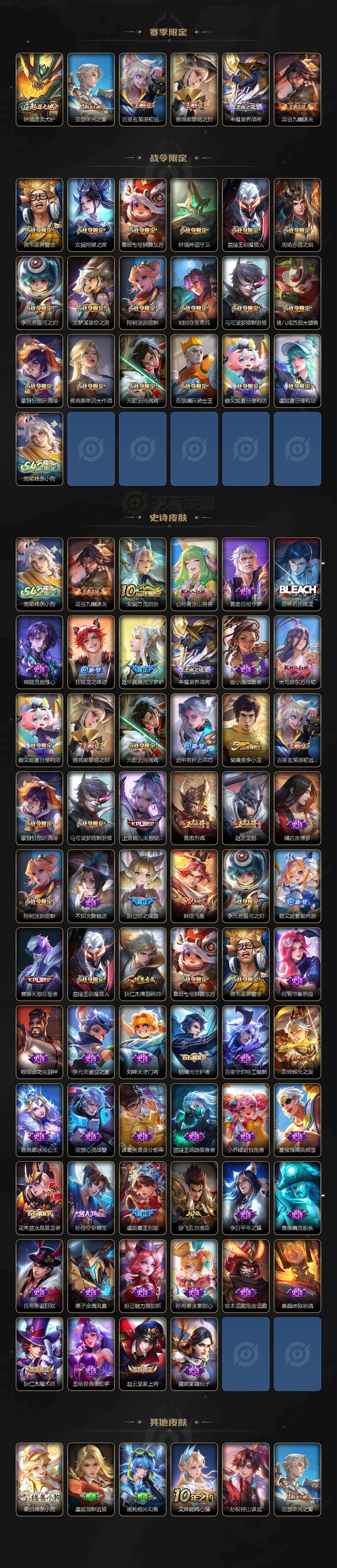 【传说皮肤】:后羿神树通天,澜愿照九州拓,桑启鸣野蒿,澜逐花归海,达摩黄金狮子座,宫本武藏地狱之眼,孙悟空地狱火