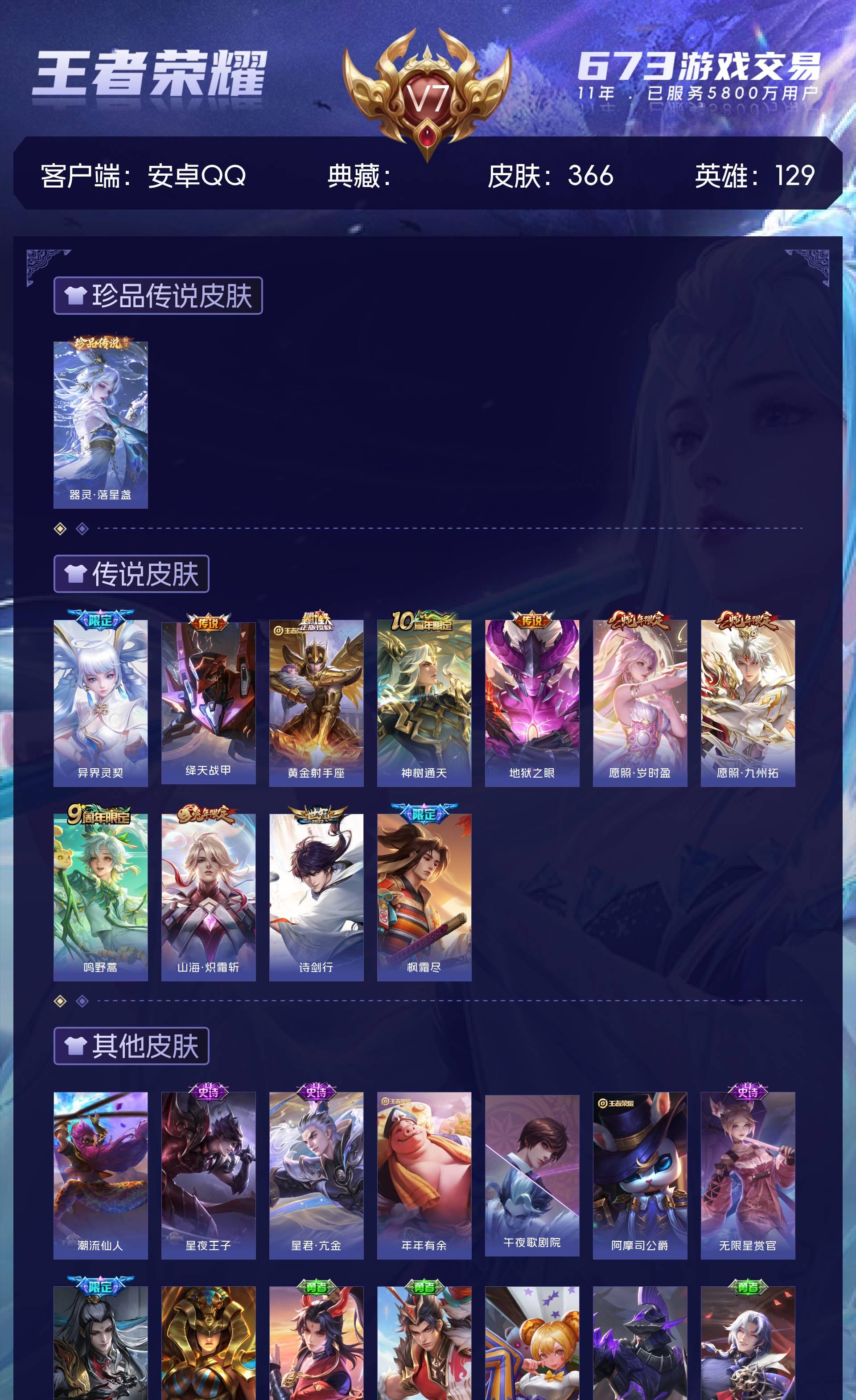 V7 皮肤366 英雄129 永恒钻石 珍品传说1 星传说1 传说11