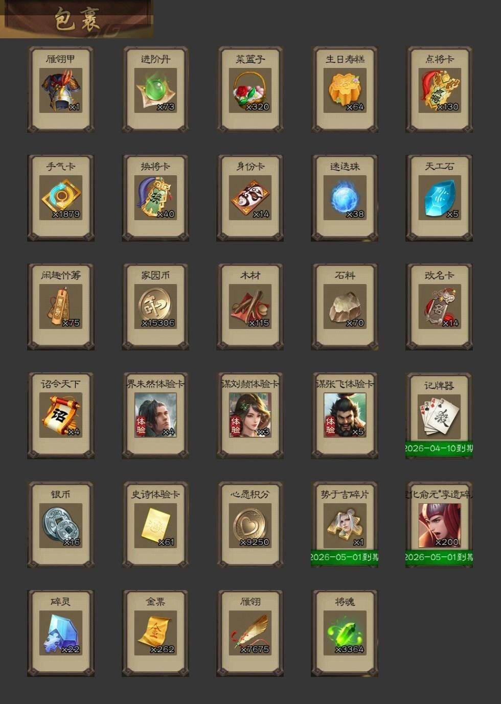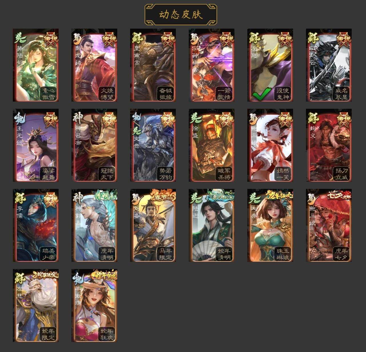 官阶:骠骑将军;VIP等级:VIP9;史诗武将数量:21;动态皮肤数量:20;