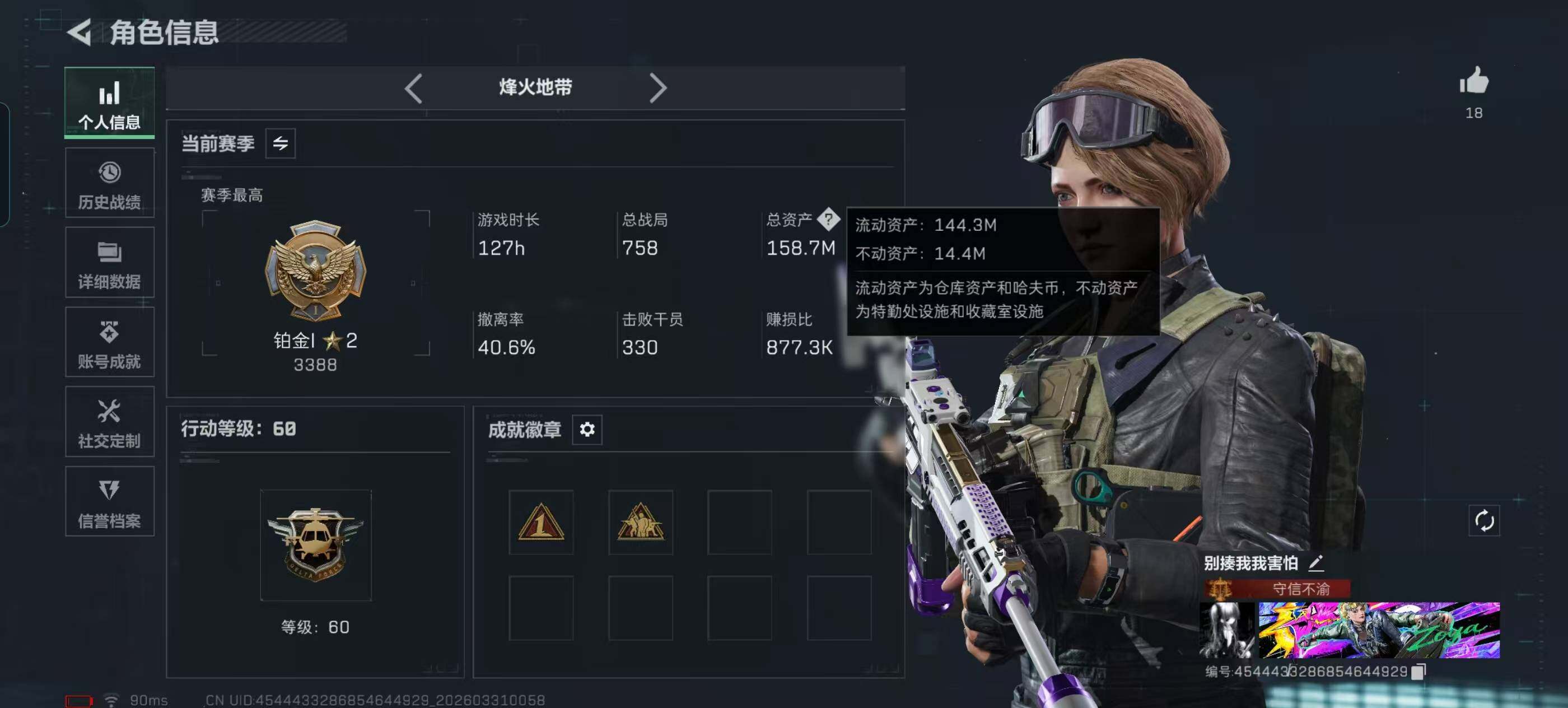【SJ1614】157m总资产-26637k哈夫币-60烽火等级-铂金-10战