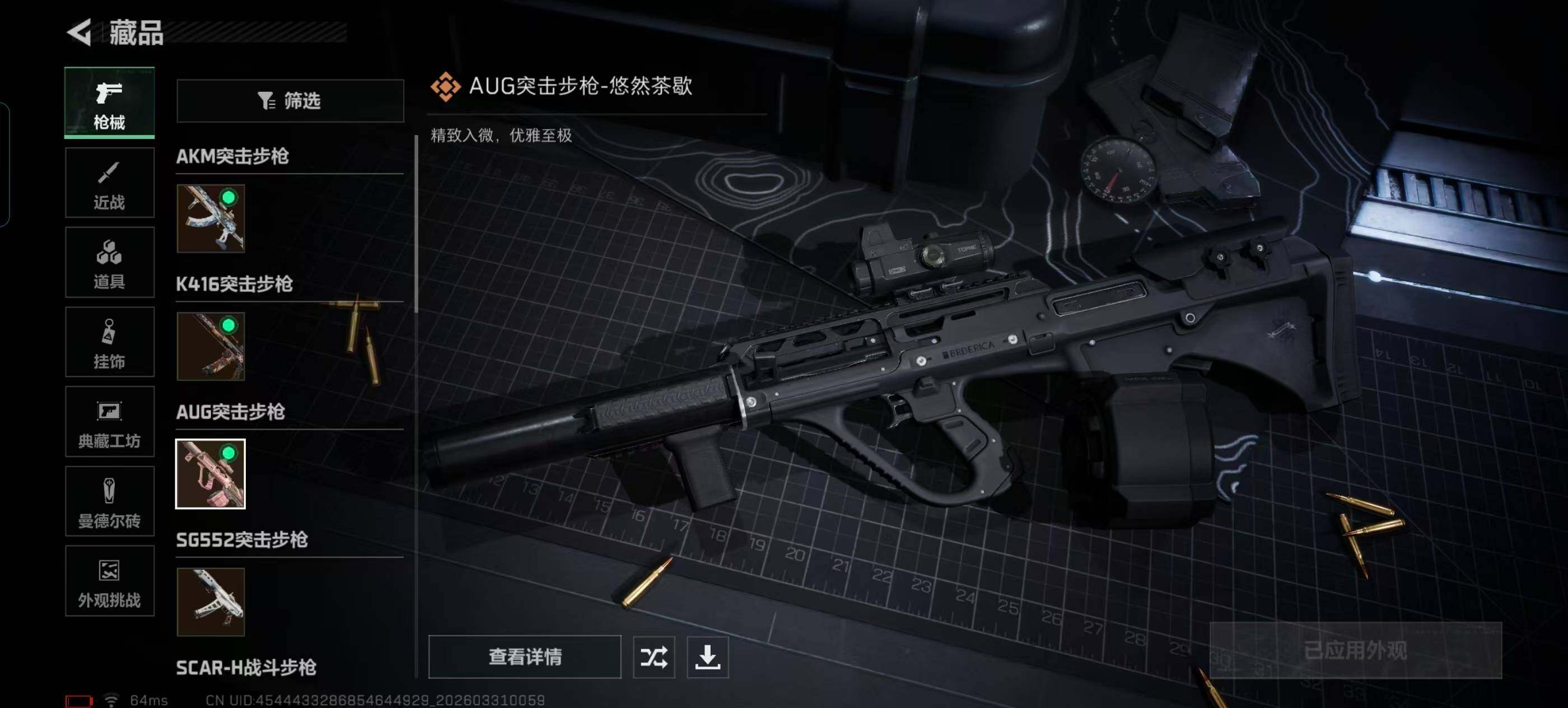 【传说外观】:AKM突击步枪-锦绣,K416突击步枪-行动记录,AUG突击步枪-悠然茶歇,SG552突击步枪-运动员,SCAR-H战斗步枪-启航,SCAR-H战斗步枪-荼蘼,K437突击步枪-