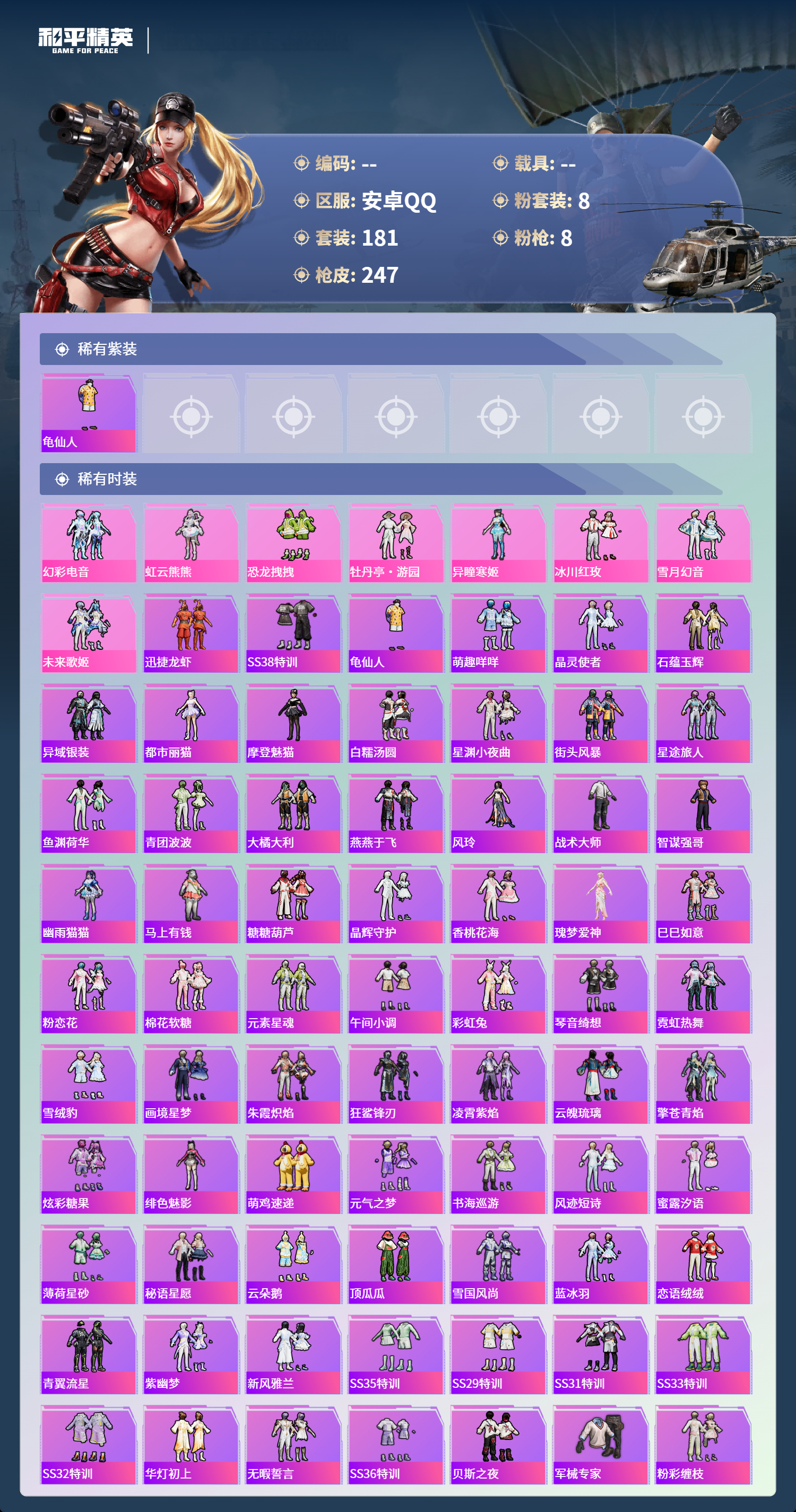 hs67838安卓手Q-15王牌印记-8粉装-8特效枪-76457热力值-181套装-247枪皮-9卓越印记-3传奇印记