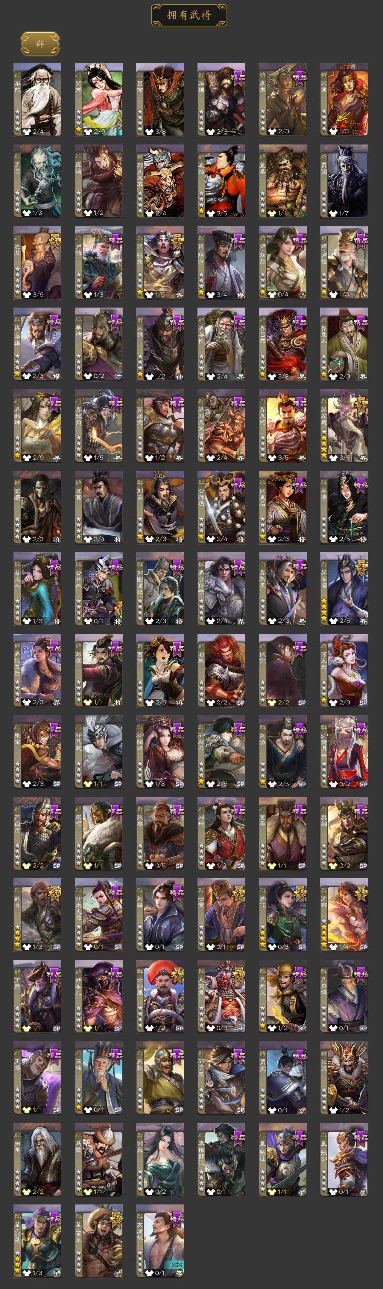 官阶:大将军;VIP等级:VIP8;史诗武将数量:35;动态皮肤数量:33;武将总数:339;史诗宝珠数量:40;将魂数量:2827;神将:5;魏国史诗武将:23;蜀国史诗武将:8;吴国史诗武将:2;群史诗武将:11