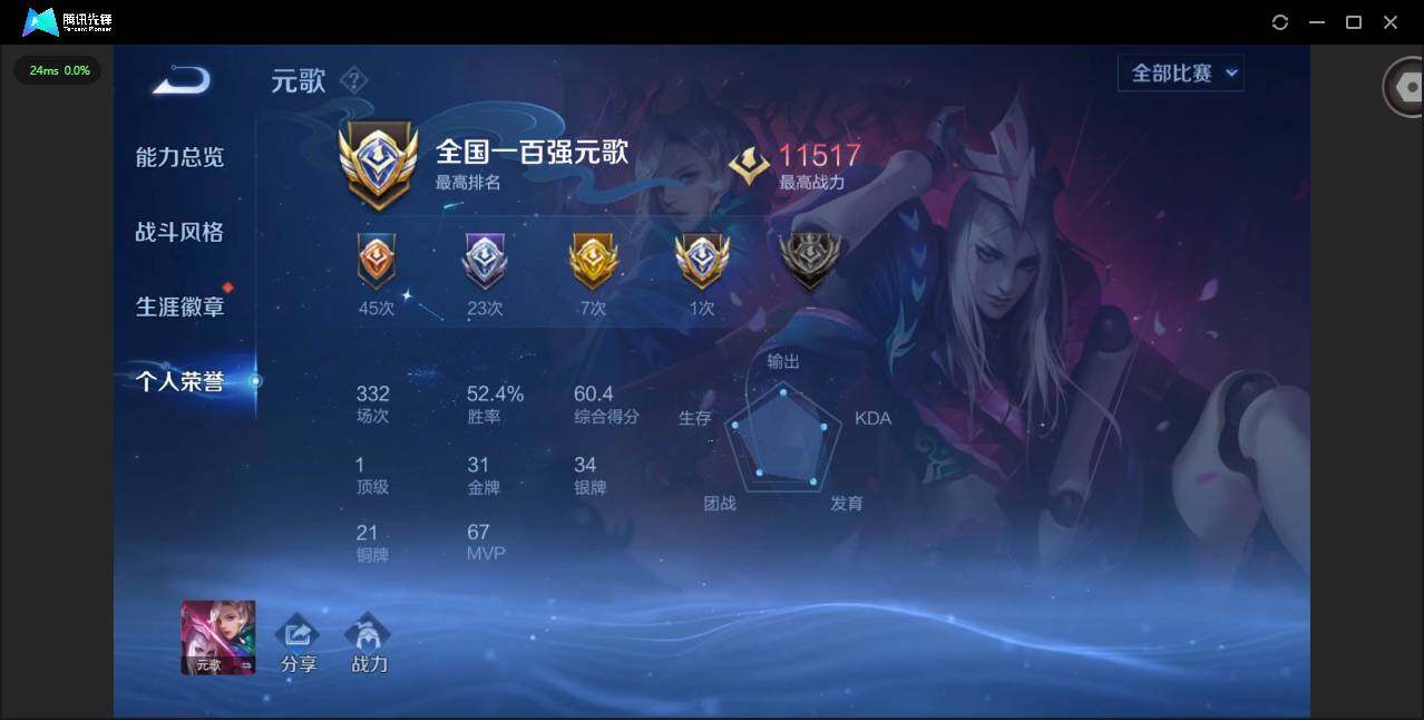 【小国标元歌】贵族等级: V8 英雄数: 128 皮肤数: 252 荣耀水晶: