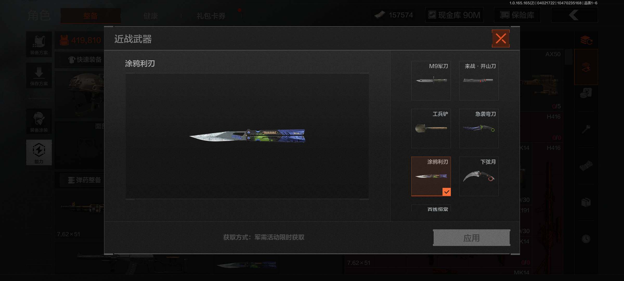 【近战武器】:工兵铲,下弦月,涂鸦利刃,急袭弯刀,百炼恒常,来战开山刀