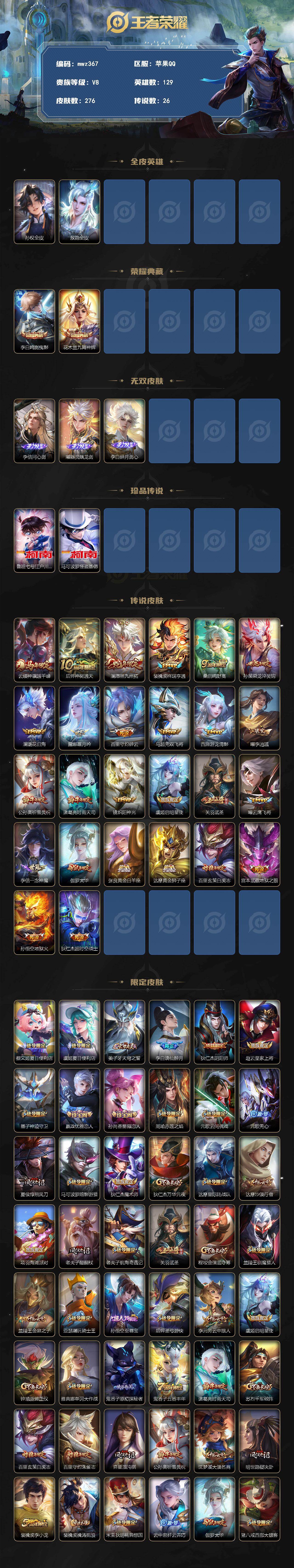 【mwz367】苹果Q-V8-至尊星耀III段位-129英雄-276皮肤-2典藏皮肤-3无双-2珍品传说-26传说-74史诗