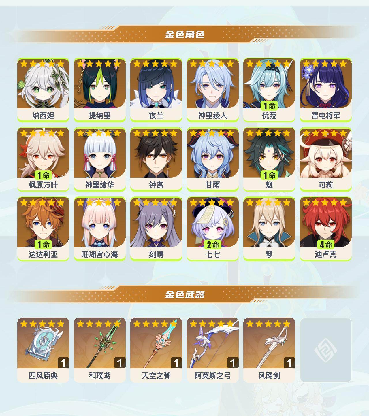 0命纳西妲,0命提纳里,0命夜兰,0命神里绫人,1命优菈,0命雷电将军,1命枫原万叶,0命神里绫华,0命钟离,0命甘雨,1命魈,0命可莉,1命达达利亚,0命珊瑚宫心海,0命刻晴,2命七七,0命琴,4命迪卢克,精1四风原典,精1和璞鸢,精1天空之脊,精1阿莫斯之弓,精1风鹰剑