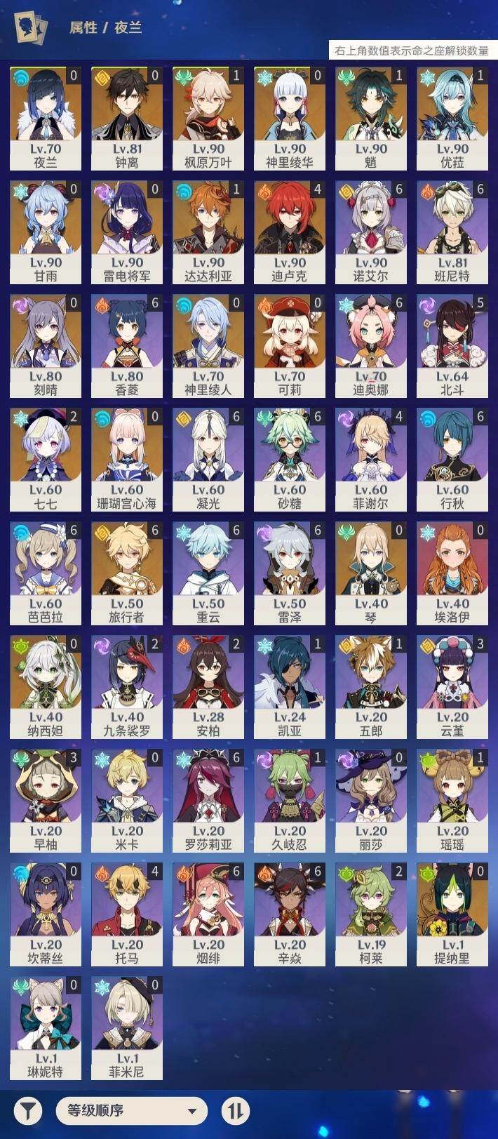 59级/33黄/男主/18个五星角色/5个五星武器0命纳西妲,0命提纳里,0命夜兰