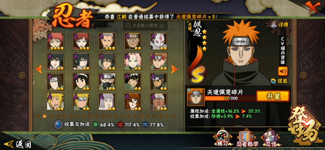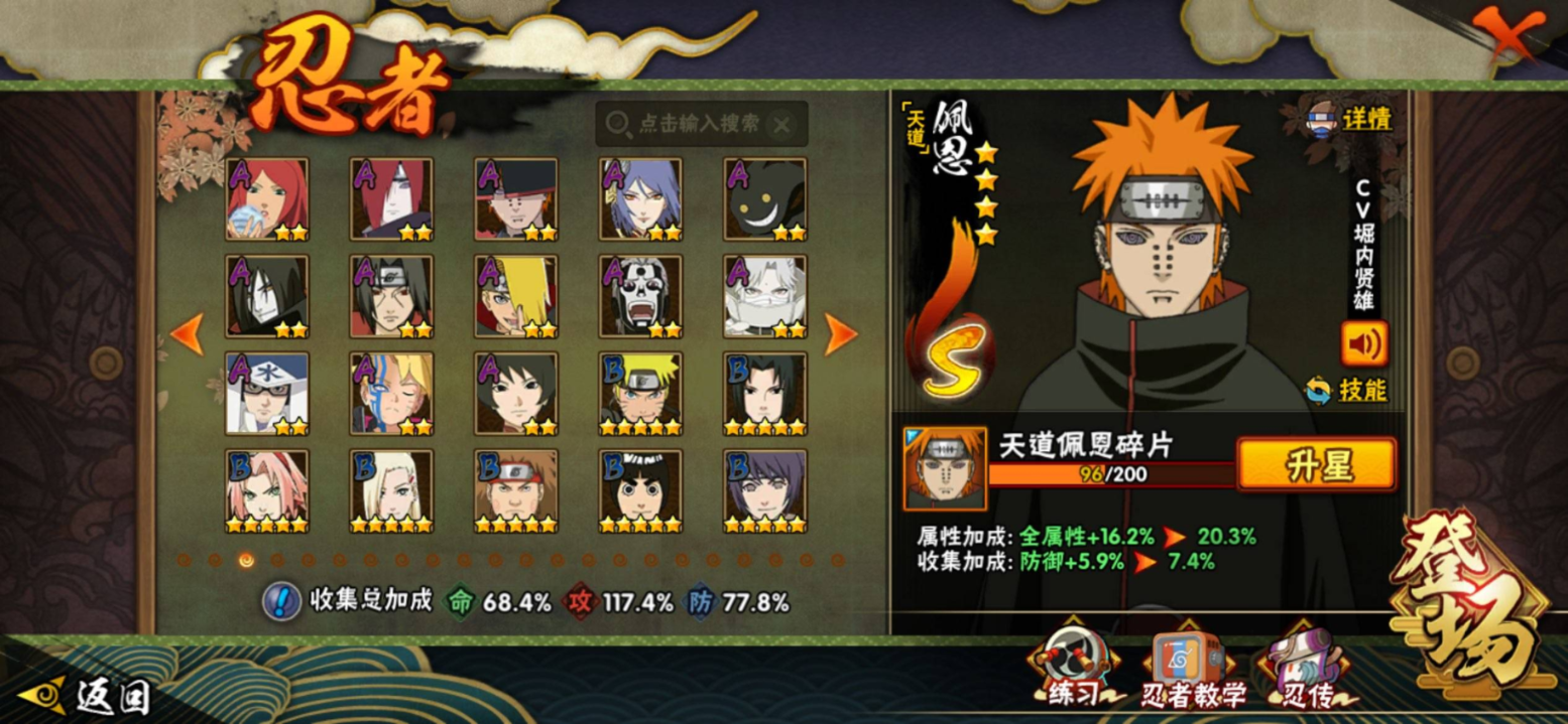 【S级忍者】大野木「忍界大战」(3星),旗木卡卡西「须佐能乎」(3星),宇智波斑「秽土转生·解」(3星),宇智波佐助「永恒万花筒」(3星),神秘面具男「红夜之刃」(3星),大筒木金式(3星),春野樱「忍界大战」(3星),漩涡鸣人「九喇嘛连结」(3星),宇智波斑「白面具」(3星),自来也「舞之豪杰」(3星