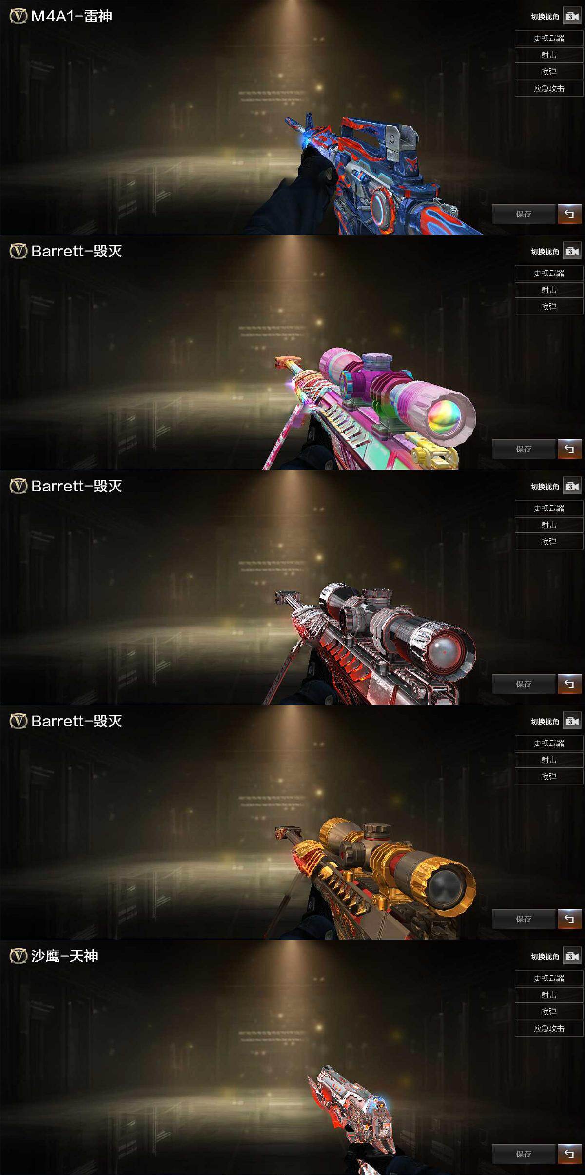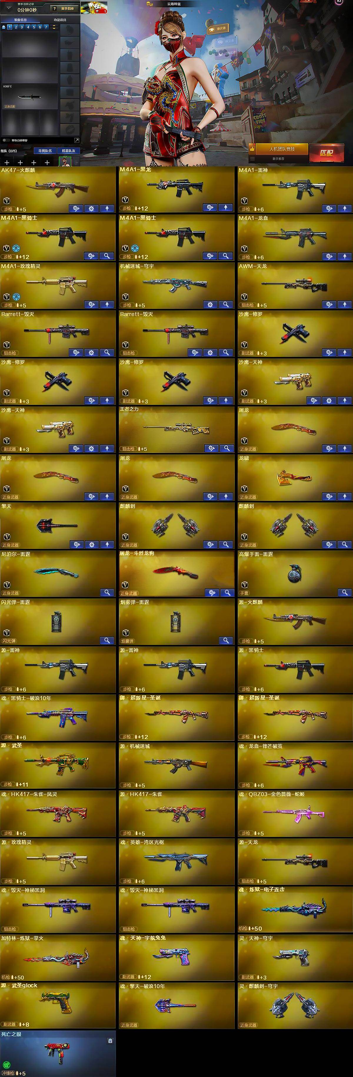 【英雄级武器】:AK47-火麒麟,M4A1-黑龙,M4A1-雷神,M4A1-黑骑士*2,M4A1-龙血,M4A1-玫瑰精灵,机械迷城-穹宇,AWM-天龙,