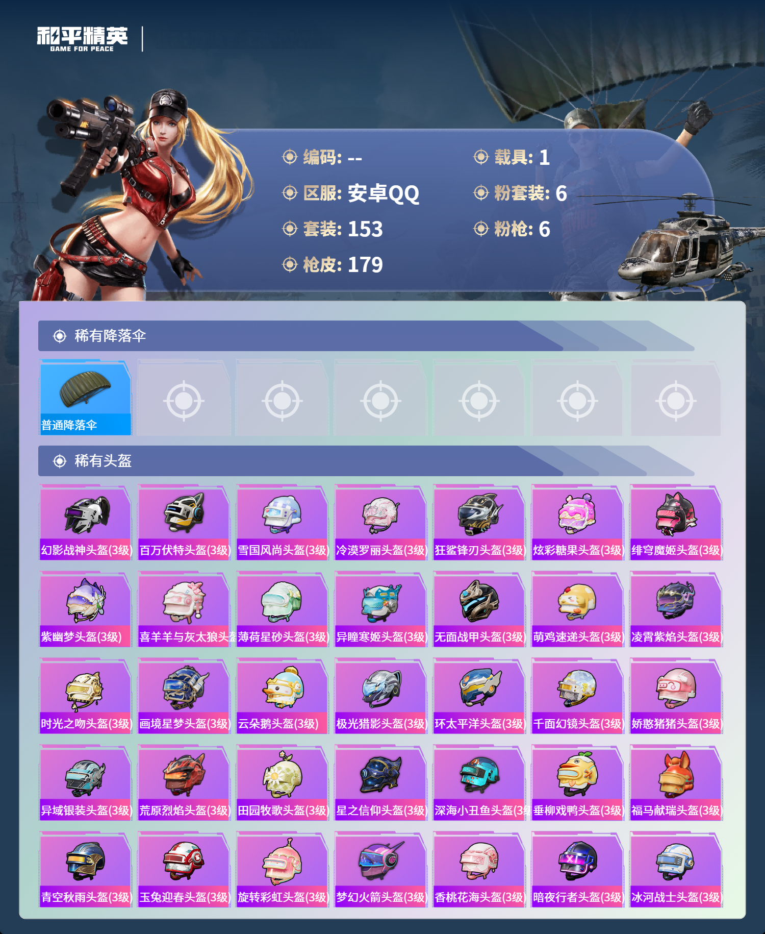 hs66796安卓手Q-9王牌印记-6粉装-6特效枪-1载具-59094热力值-153套装-179枪皮-1卓越印记-1传奇印记