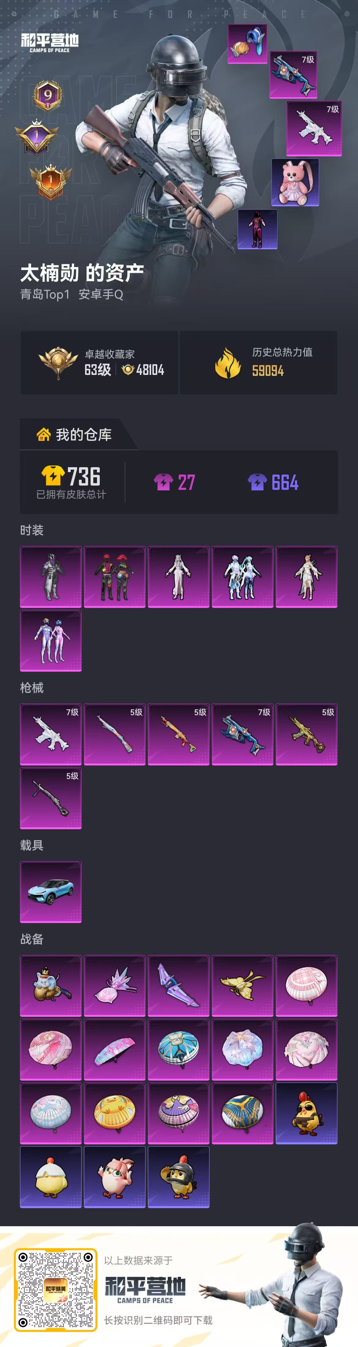 9王牌印记-6粉装-6特效枪-1载具-59094热力值-153套装-179枪皮-1卓越印记-1传奇印记